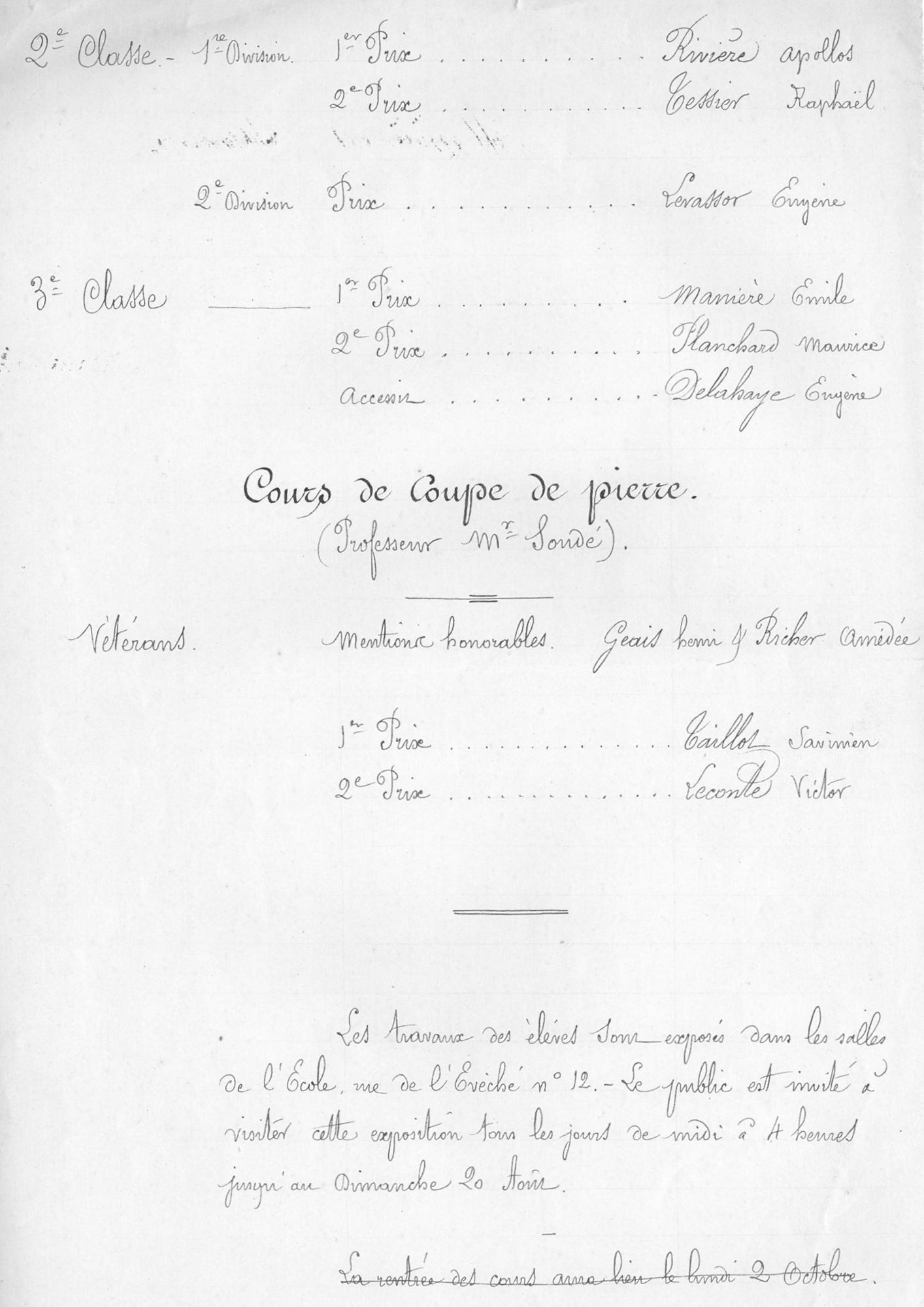 En 1899, parmi les 8 cours dispensés dans l’école, 93 prix et 43 accessits viennent récompenser les élèves les plus méritants, dont le prix d’honneur, le prix Ladureau. D’une valeur considérable de 450 francs, ce prix est décerné sous la forme d’un livret de Caisse d’épargne.
