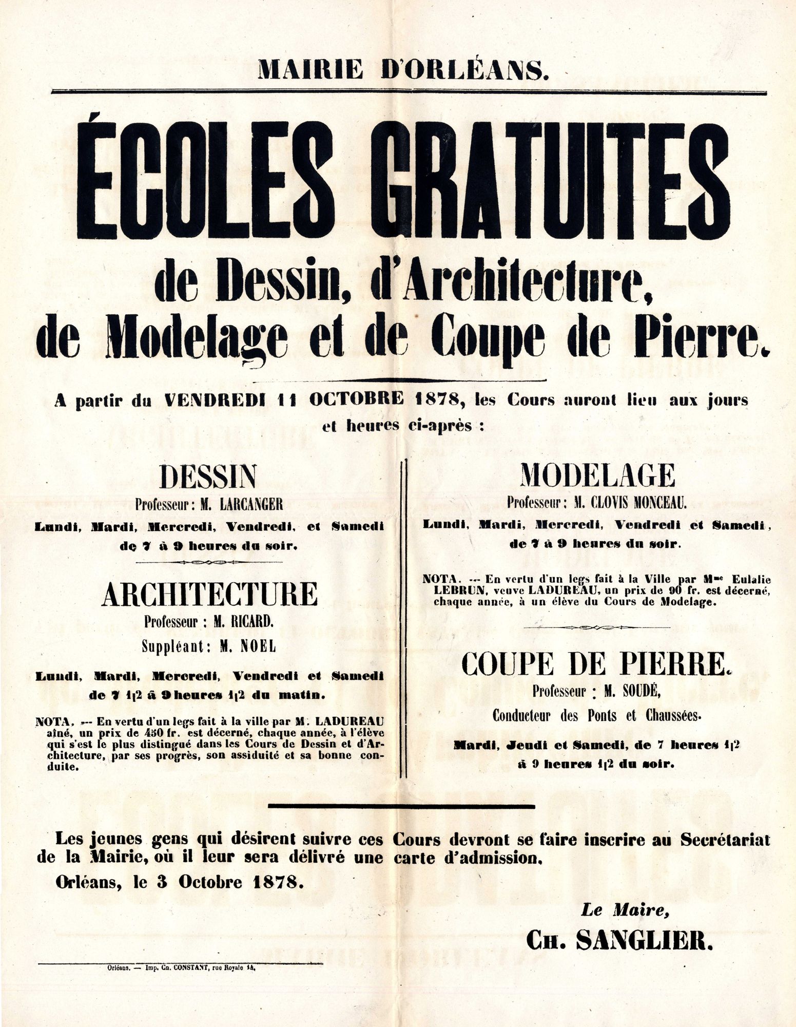 Ecoles gratuites de dessin, d'architecture, de modelage et de coupe de pierre. 1878. Affiche administrative. AMO, 15Fi719
