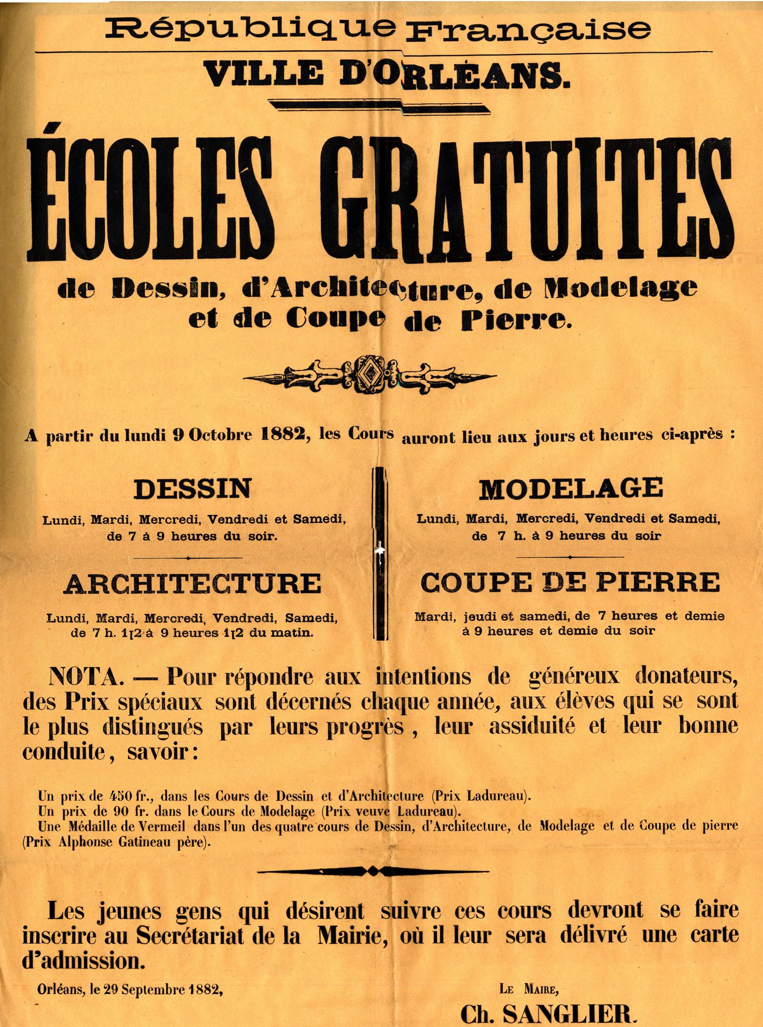Ecoles gratuites de dessin, d'architecture, de modelage et de coupe de pierre. 1882. Affiche administrative. AMO, 15Fi953