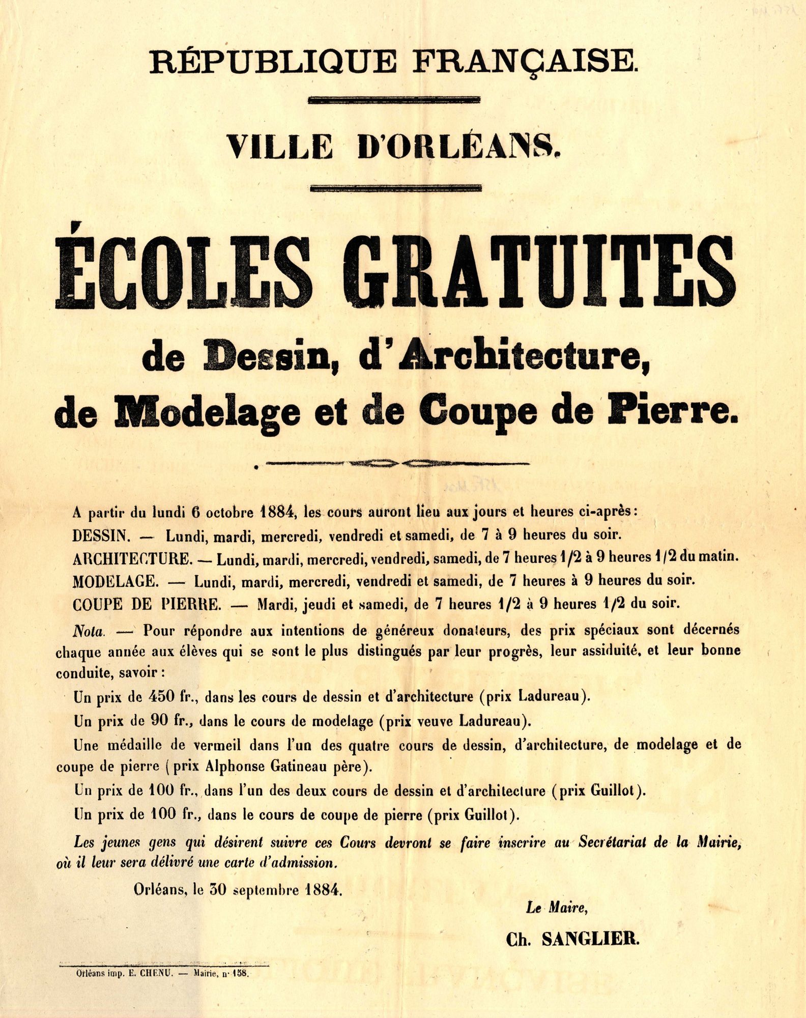 Ecoles gratuites de dessin, d'architecture, de modelage et de coupe de pierre. 1884. Affiche administrative. AMO, 15Fi1101