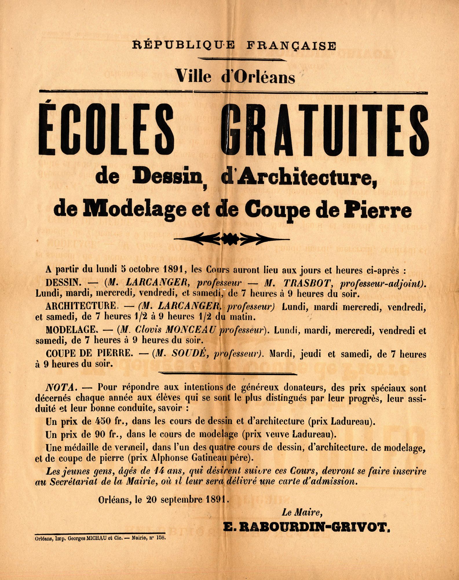 Ecoles gratuites de dessin, d'architecture, de modelage et de coupe de pierre. 1891. Affiche administrative. AMO, 15Fi1666