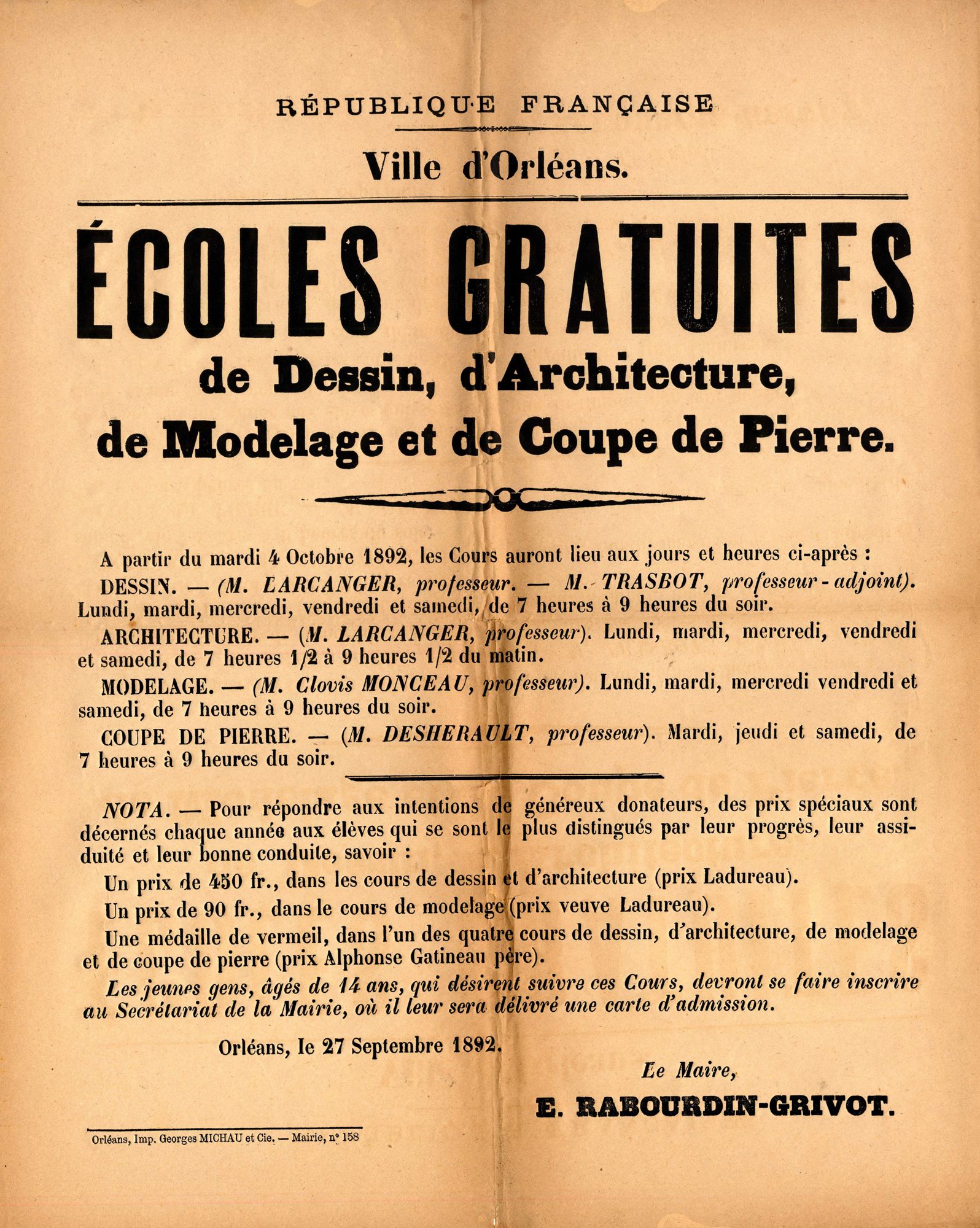 Ecoles gratuites de dessin, d'architecture, de modelage et de coupe de pierre. 1892. Affiche administrative. AMO, 15Fi1701
