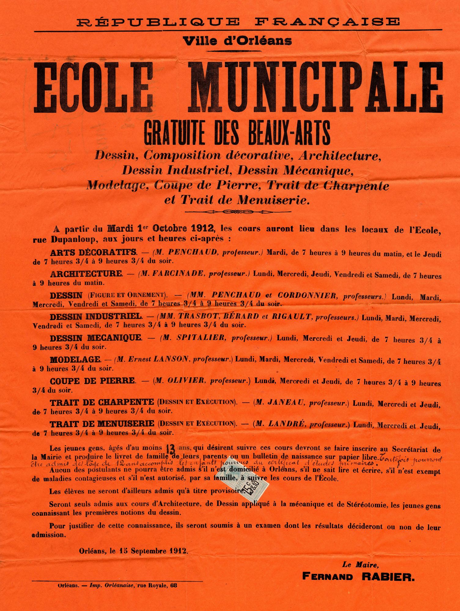 Ecole municipale gratuite des beaux-arts. Dessin, composition décorative, architecture, dessin industriel, dessin mécanique, modelage, coupe de pierre, trait de charpente et trait de menuiserie. 1912. Affiche administrative. AMO, 15Fi1835