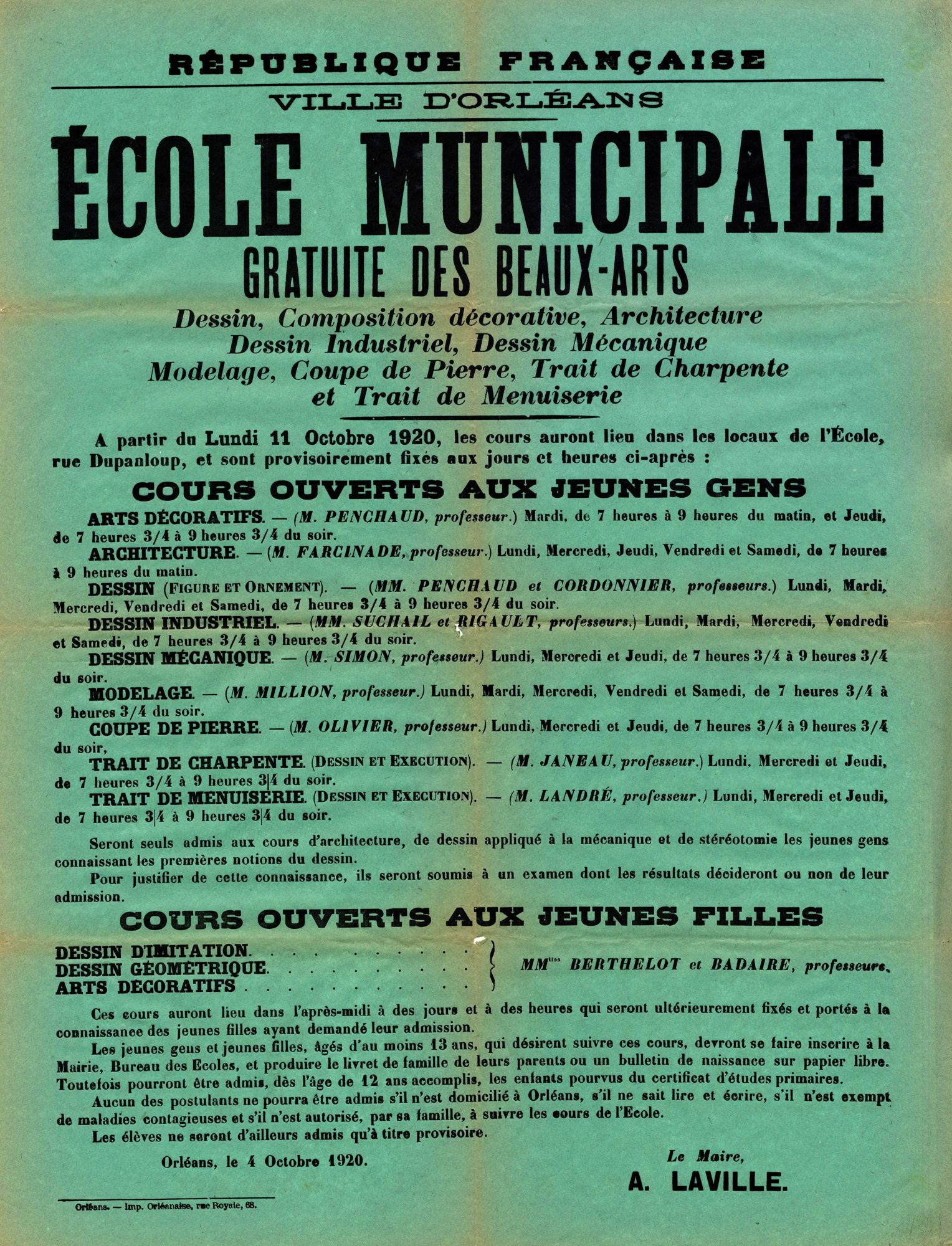 Ecole municipale gratuite des beaux-arts. Dessin, composition décorative, architecture, dessin industriel, dessin mécanique, modelage, coupe de pierre, trait de charpente et trait de menuiserie. 1920. Affiche administrative. AMO, 15Fi2214