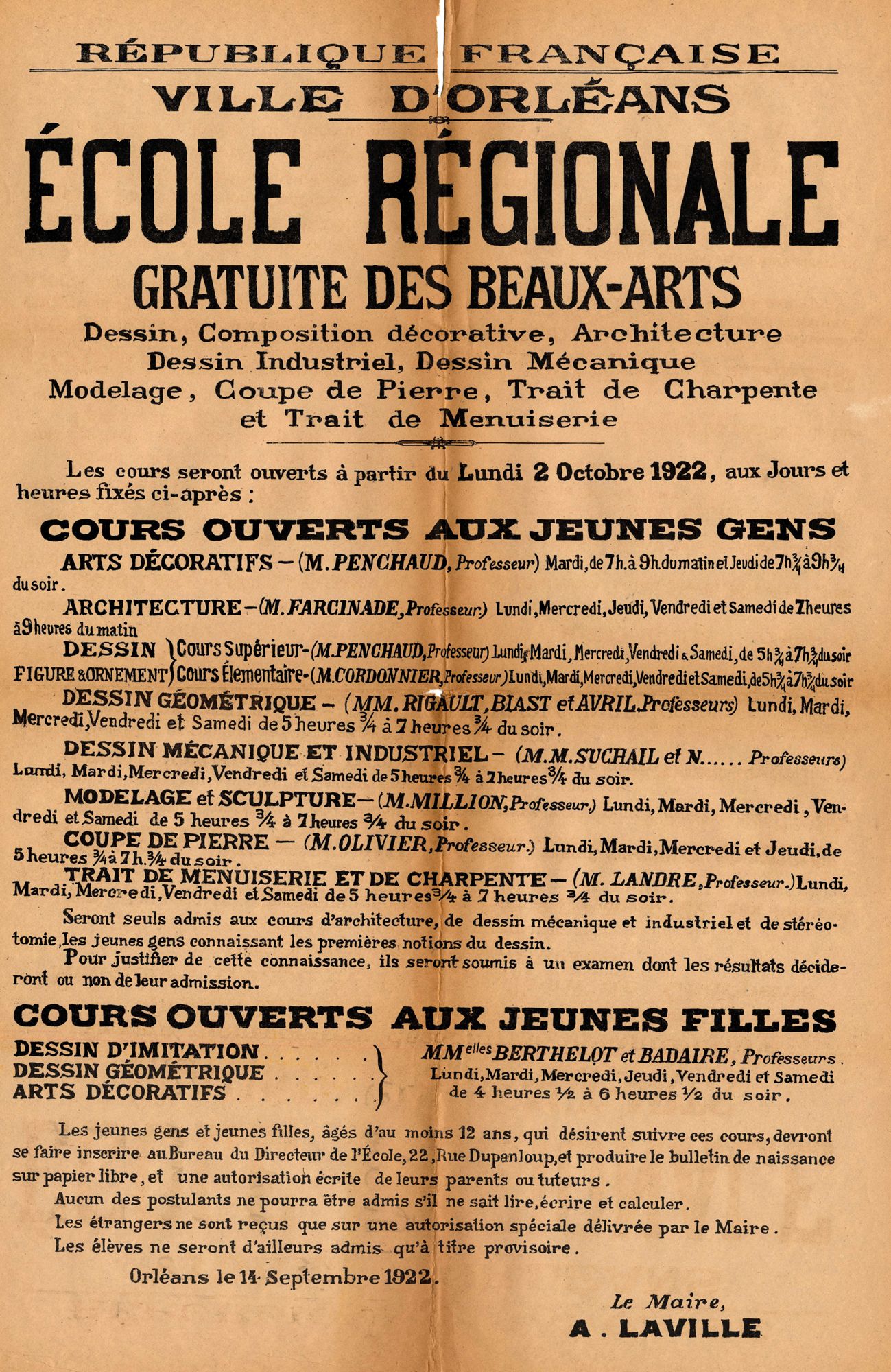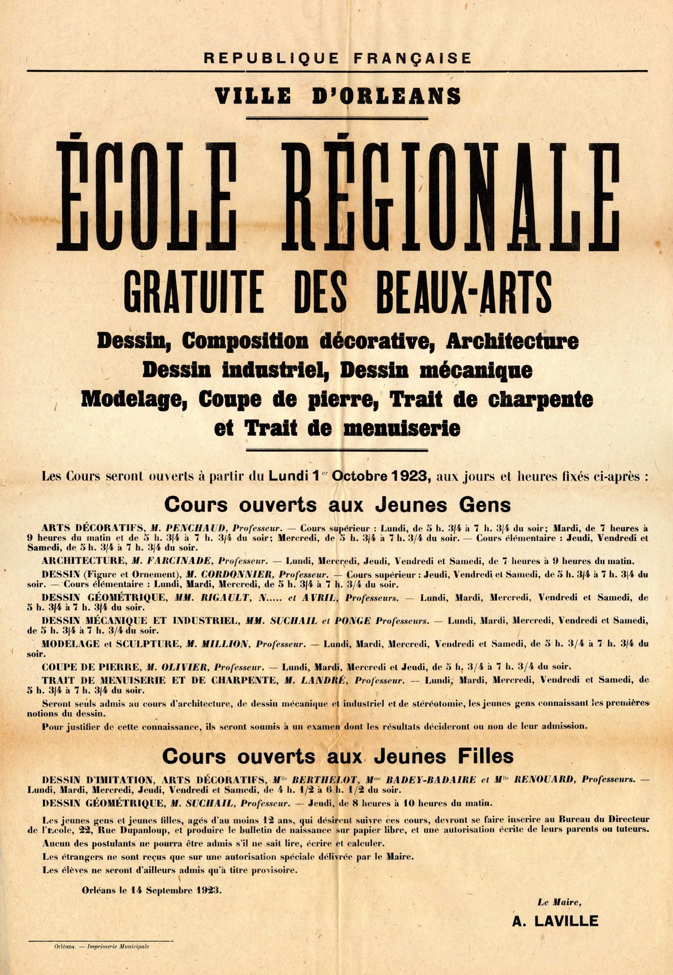 Ecole régionale gratuite des beaux-arts. Dessin, composition décorative, architecture, dessin industriel, dessin mécanique, modelage, coupe de pierre, trait de charpente et trait de menuiserie. 1922. Affiche administrative. AMO, 15Fi2270