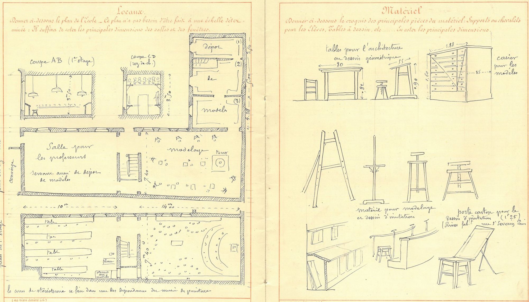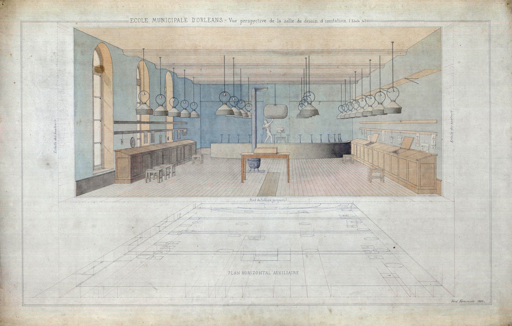 Trente ans plus tard en 1855, le musée manque de place pour accueillir les collections archéologiques appartenant au Département et à la Société archéologique qui doivent être remises à la Ville. On prévoit alors d’installer les 2 classes communales de dessin et d’architecture dans les « anciens cénacles » dépendants des bâtiments de la Bibliothèque. Une somme de 2 700 francs est allouée aux travaux de réparation et d’aménagement des lieux. L’Ecole de dessin est alors dotée d’un vaste et commode bâtiment et dispose de nouvelles salles bien éclairées, comme le mentionnent les rapports annuels d’activité en 1860 et 1864. Les cours de coupe de pierre, supprimés faute de nouveaux locaux adéquats, sont rétablis à destination des ouvriers en architecture à la rentrée de 1866.