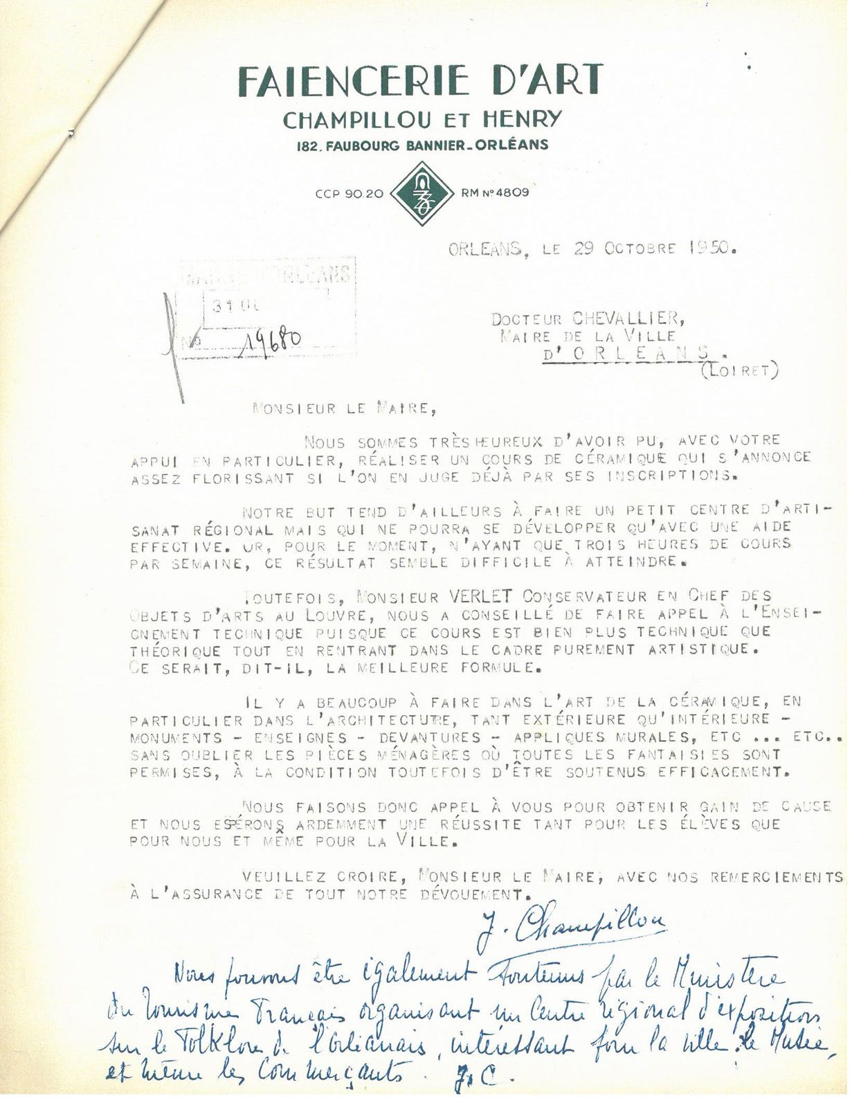 Au cours de l’année 1949, les céramistes Jeanne Champillou et Aimé Henry proposent à la Ville d’installer un cours de céramique dans le cadre de l’école. Plusieurs contacts avec le maire, Pierre Chevallier, leur permettent de présenter leur projet de : développement et diffusion de l’art régional de l’orléanais, programme d’études qu’ils souhaitent conduire dans leur atelier de céramique d’art installé 182 Faubourg Bannier aux Aydes.