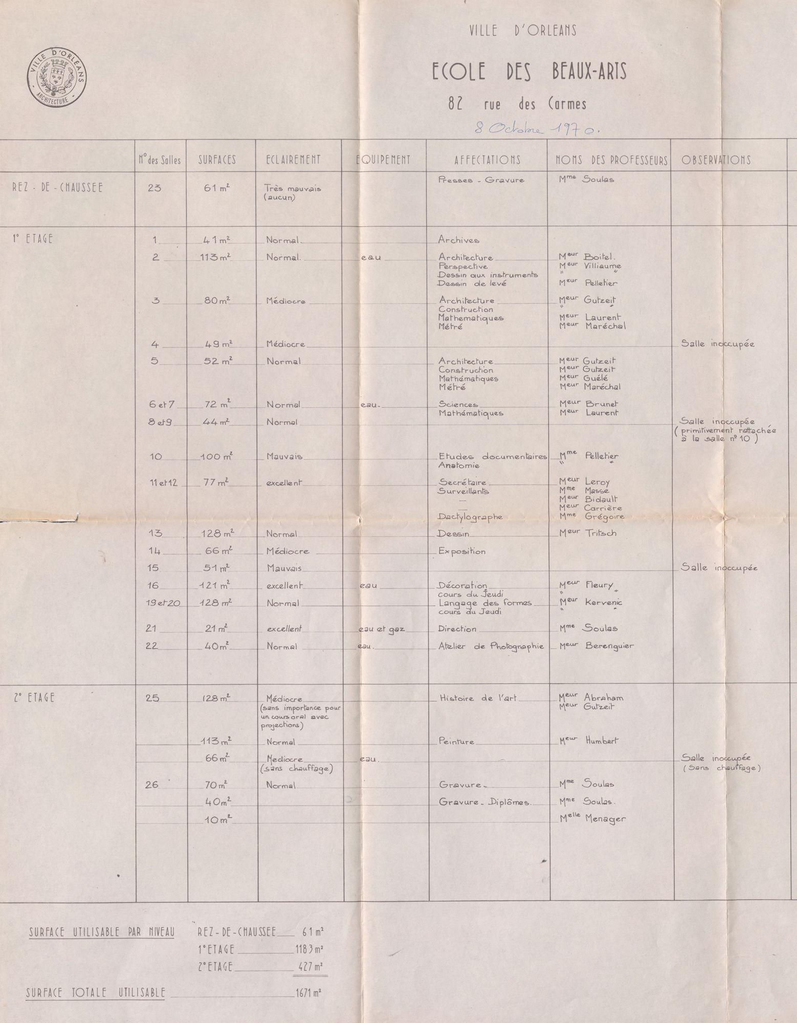 Le déménagement général de l’école, ateliers et salles de cours, débute dans le courant de l’été 1968 et nécessite une logistique importante. Une partie du matériel est entreposé dans des locaux scolaires vacants et dans l’entrée de l’immeuble Belleteste. Le matériel du cours de décoration, installé 2 bis rue des Anglaises, est entreposé dans une salle de l’ancien Lycée Pothier [rue Jeanne d’Arc], tandis que les presses du cours de gravure et le matériel du cours de sculpture peuvent être transférés dans les locaux libérés de la rue des Anglaises.