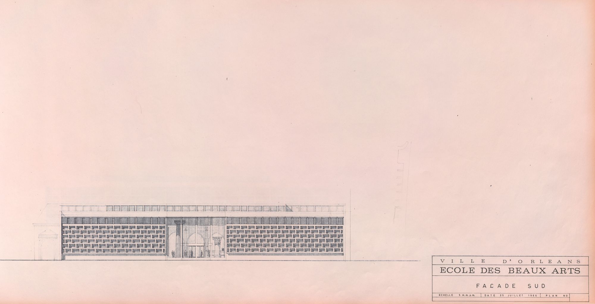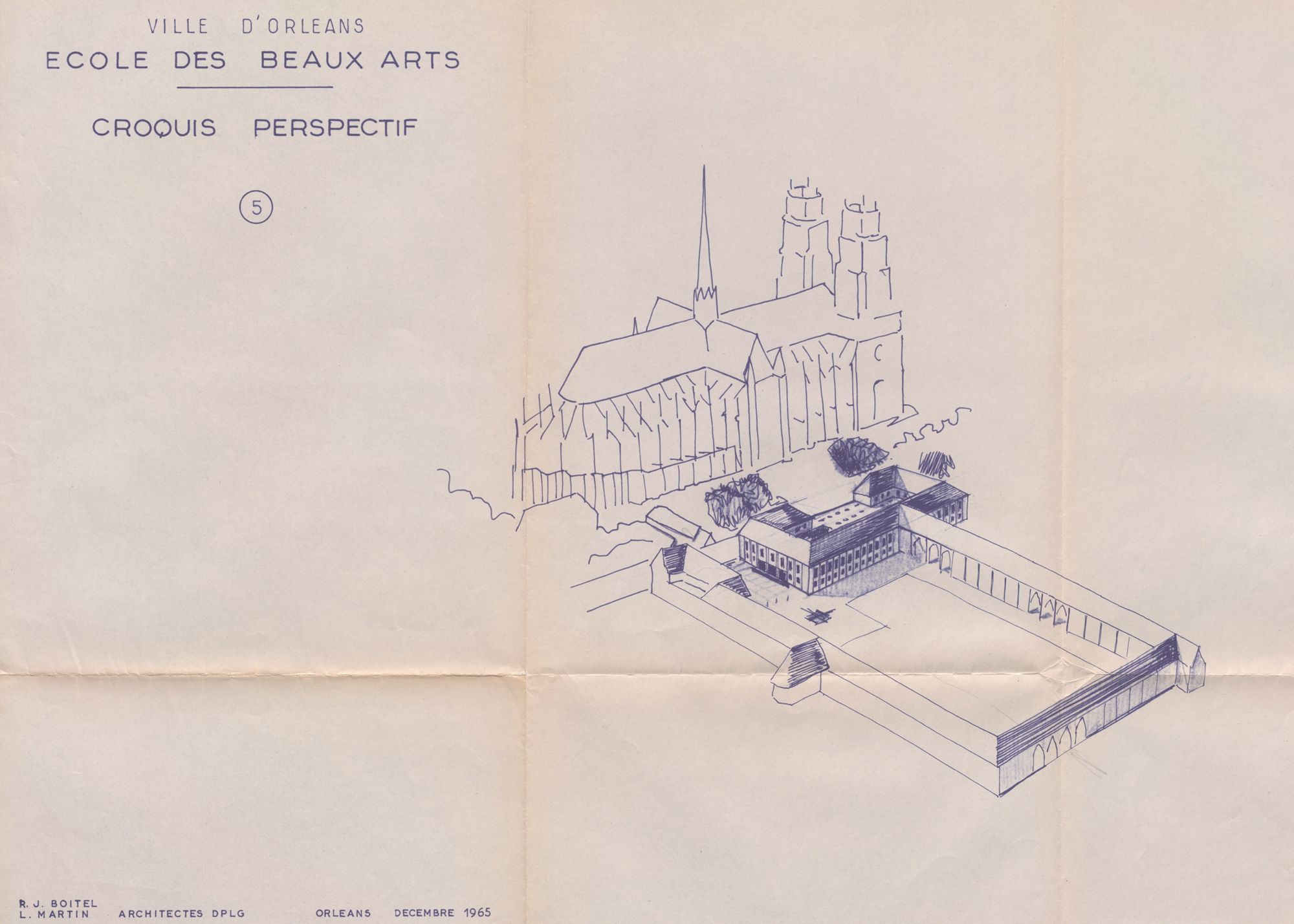 Lors de sa séance du 22 septembre 1961, le conseil municipal approuve le contrat passé avec l’architecte Lucien Martin qui est désigné pour l’étude et la réalisation de la reconstruction de l’Ecole des beaux-arts d’Orléans. Un avant-projet, défini avec les conseils de l’architecte des Bâtiments de France, Robert Boitel, est examiné et approuvé en séance du 23 mars 1963.