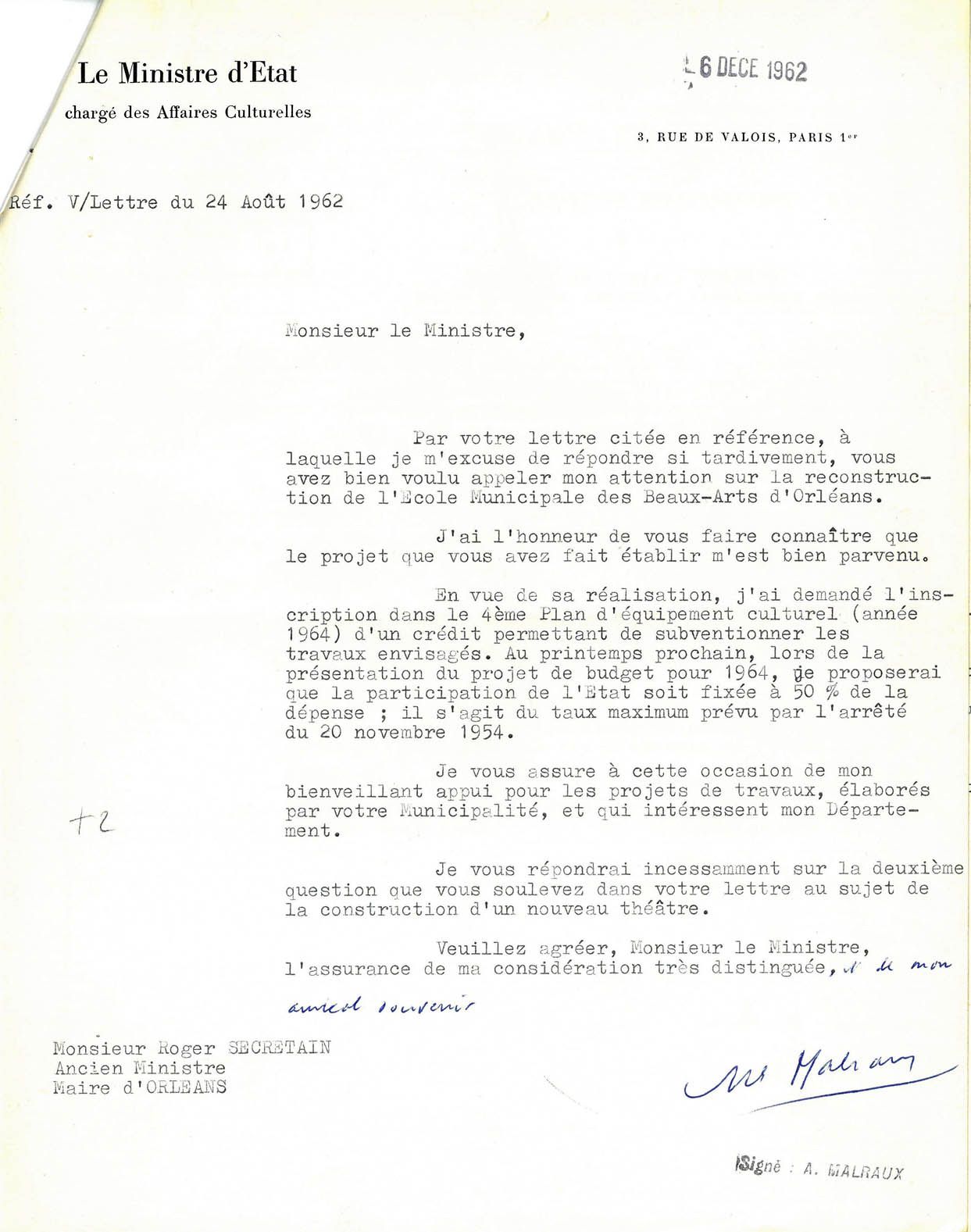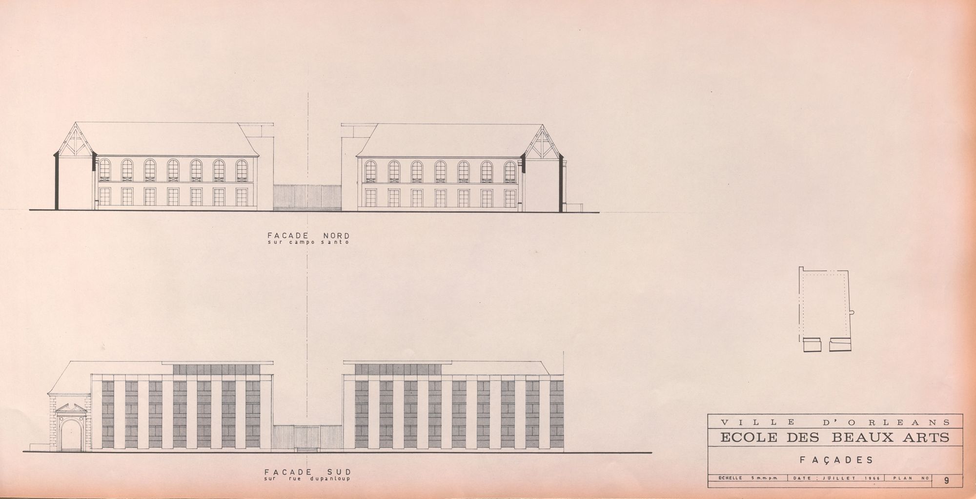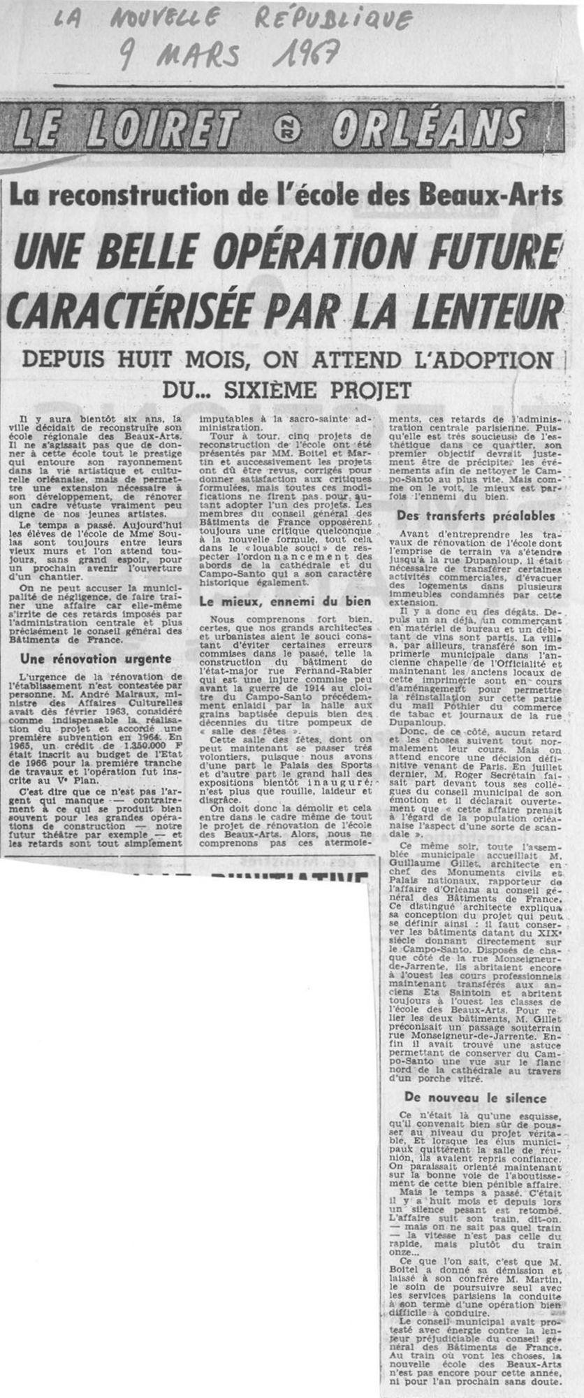 De 1961 à 1967, 9 avant-projets successifs sont soumis à l’appréciation du Conseil général des Bâtiments de France et du Conseil supérieur des Monuments historiques. Les deux administrations émettent des avis divergents, tout en rejetant les propositions des architectes. Les difficultés rencontrées provoquent l’intervention en personne du maire, Roger Secrétain, auprès du ministre des Affaires culturelles, André Malraux. Le ministre souhaite alors inscrire le programme de reconstruction de l’Ecole des beaux-arts d’Orléans dans le quatrième plan d’équipement culturel (budget de l’année 1964). La participation de l’Etat est envisagée à hauteur de 50% de la dépense.