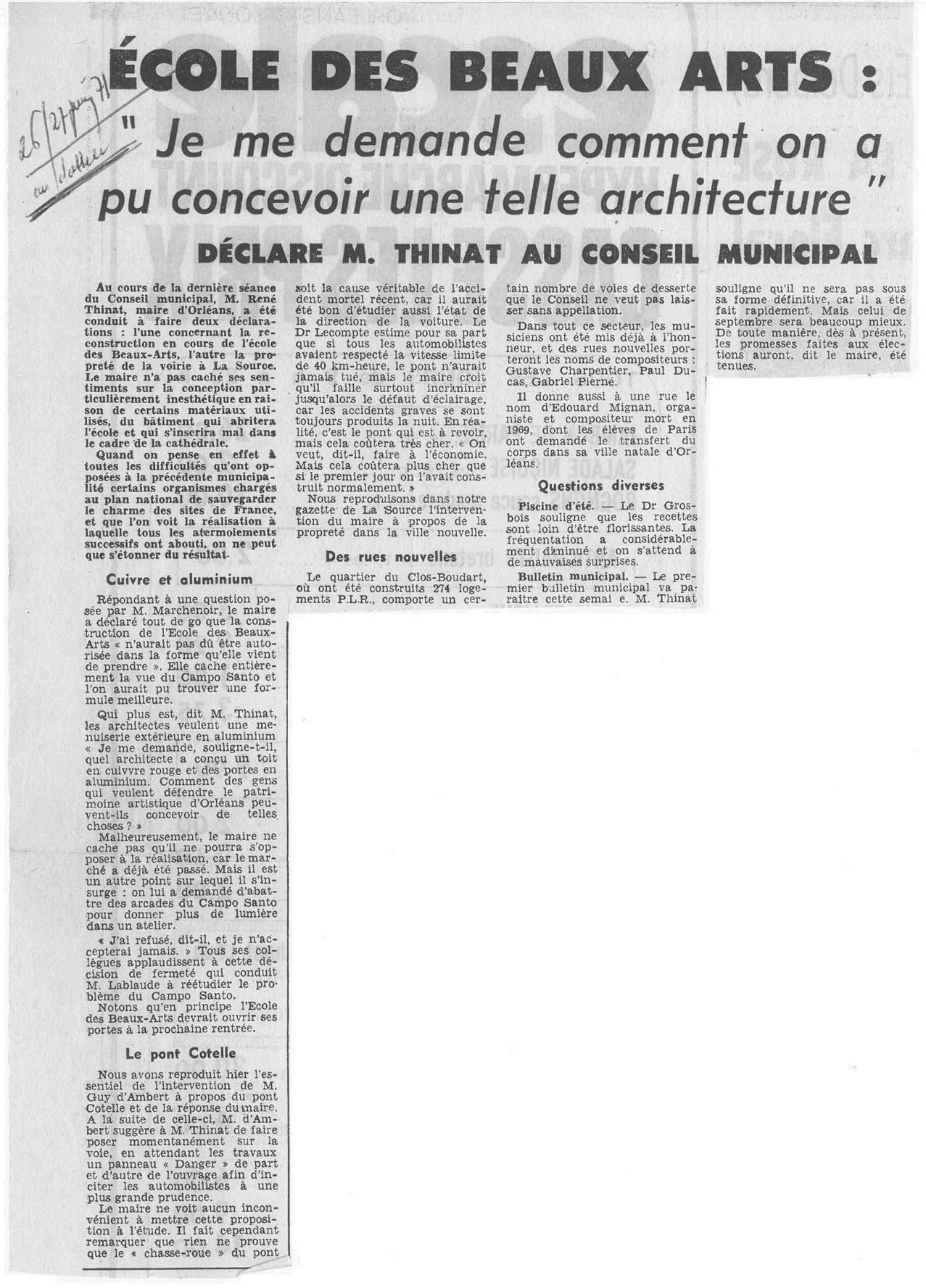 Par courrier du 22 septembre 1967, une nouvelle intervention du maire, Roger Secrétain, auprès du ministre, André Malraux, exprime le complet découragement de l’équipe municipale devant l’échec de l’aboutissement du projet de reconstruction de l’école d’Orléans.