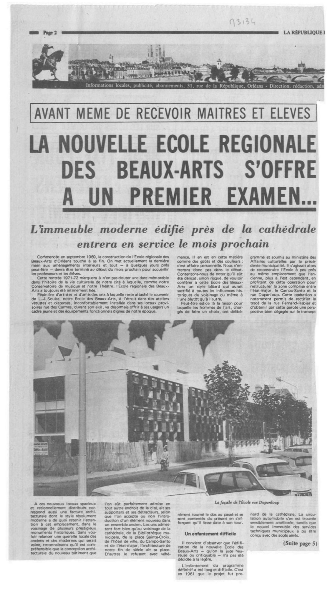Par arrêté préfectoral du 18 novembre 1964, le projet de reconstruction de l’Ecole des beaux-arts d’Orléans est déclaré d’utilité publique et la Ville est autorisée à acquérir les immeubles nécessaires à la réalisation de l’opération.