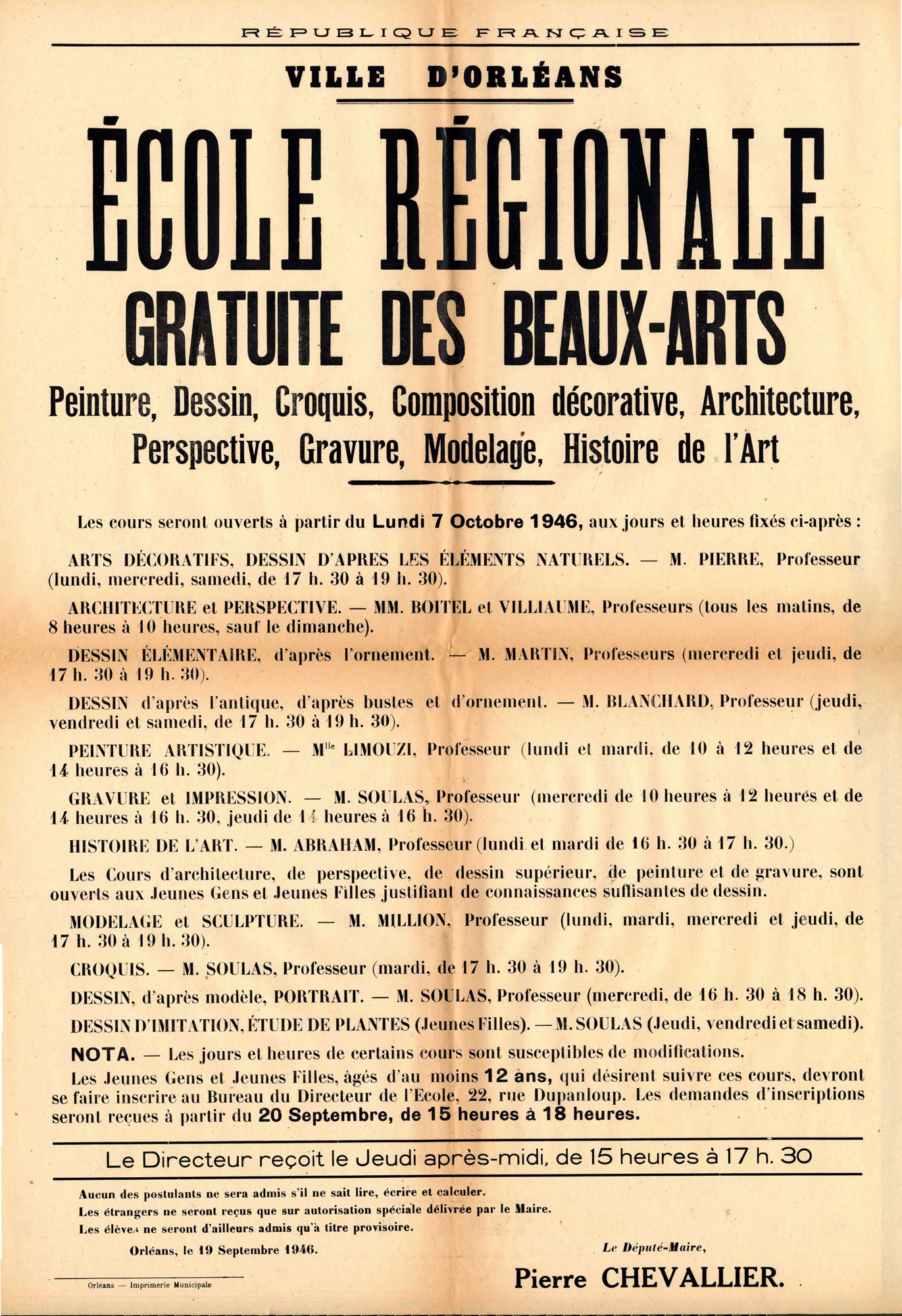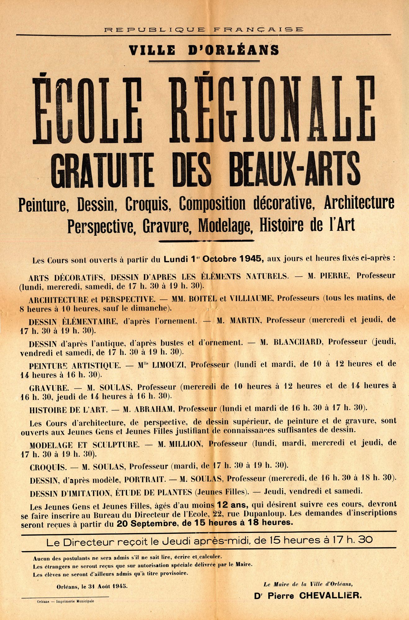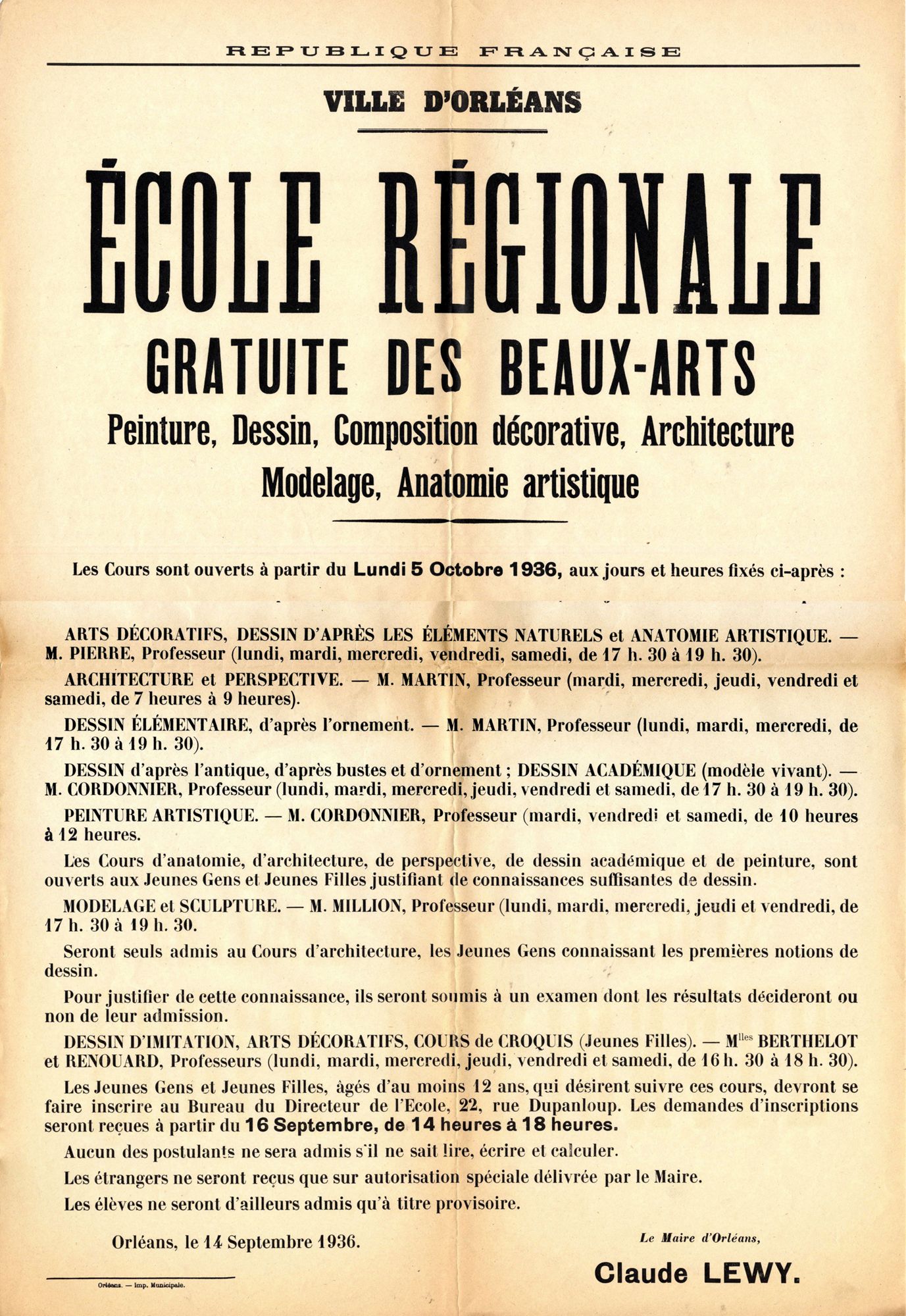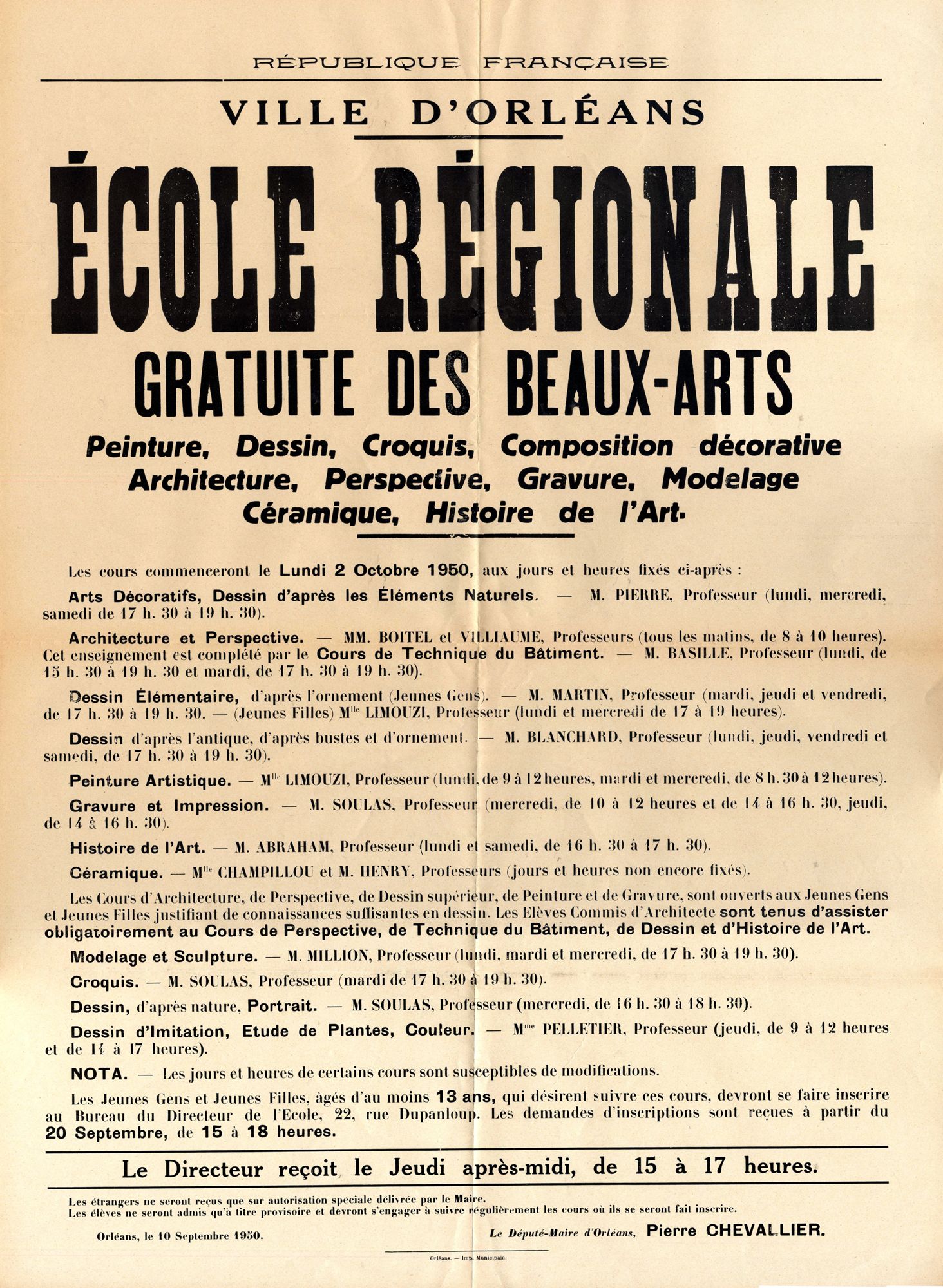 L'ouverture et l'évolution des cours au fil des affiches administratives : 1925-1972 L'ouverture et l'évolution des cours au fil des affiches administratives : 1925-1956 Cours professionnels obligatoires. Inscriptions. 1925. Affiche administrative. AMO, 15Fi2337 Cours professionnels obligatoires. Inscriptions. 1926. Affiche administrative. AMO, 15Fi2368 Cours professionnels obligatoires. Inscriptions. 1929. Affiche administrative. AMO, 15Fi2423 Cours professionnels obligatoires. Inscriptions. 1930. Affiche administrative. AMO, 15Fi2442 Ecole régionale gratuite des beaux-arts. Peinture, dessin, composition décorative, architecture, modelage, anatomie artistique. 1936. Affiche administrative. AMO, 15Fi2533 Cours professionnels obligatoires. Inscriptions. 1937. Affiche administrative. AMO, 1R1121 Ecole régionale gratuite des beaux-arts. Peinture, dessin, composition décorative, architecture, modelage, anatomie artistique. 1937. Affiche administrative. AMO, 15Fi2547 Ecole régionale gratuite des beaux-arts. Peinture, dessin, croquis, composition décorative, architecture, perspective, gravure, modelage, histoire de l'art. 1945. Affiche administrative. AMO, 15Fi2637 Ecole régionale gratuite des beaux-arts. Peinture, dessin, croquis, composition décorative, architecture, perspective, gravure, modelage, histoire de l'art. 1946. Affiche administrative. AMO, 15Fi2647 Ecole régionale gratuite des beaux-arts. Peinture, dessin, croquis, composition décorative, architecture, perspective, gravure, modelage, céramique, histoire de l'art. 1950. Affiche administrative. AMO, 15Fi2669 Ecole régionale gratuite des beaux-arts. Peinture, dessin, croquis, étude de nu, composition décorative, architecture, perspective, gravure, modelage, céramique, histoire de l'art. 1955. Affiche administrative. AMO, 15Fi2689 Ecole régionale gratuite des beaux-arts. Peinture, dessin, croquis, étude de nu, composition décorative, architecture, perspective, gravure, modelage, céramique, histoire de l'art, anatomie. 1956. Affiche administrative. AMO, 1R2041 Ecole régionale des beaux-arts d'Orléans. Enseignement-Admission. 1972. Affiche administrative. AMO, 1R2046 1 / 13