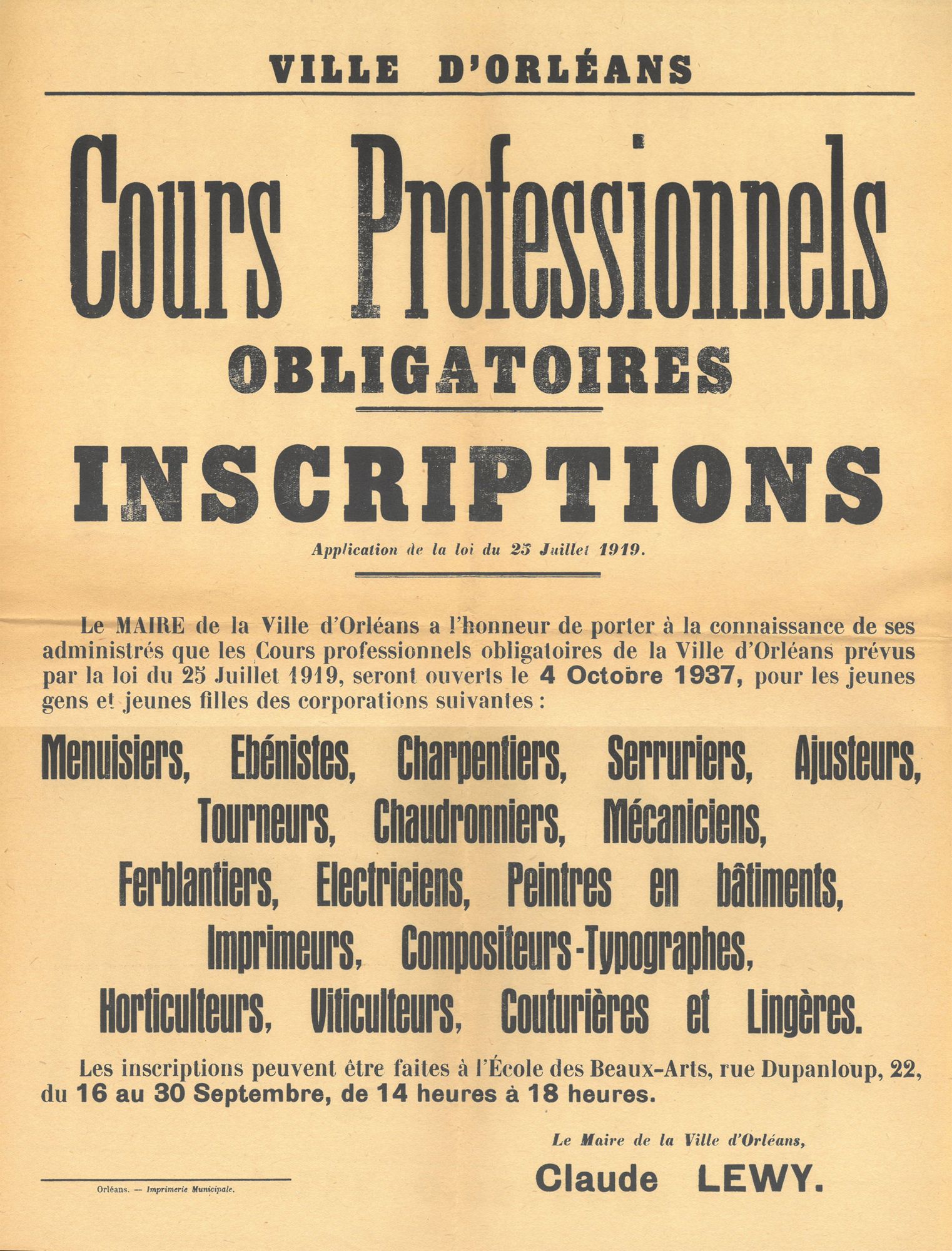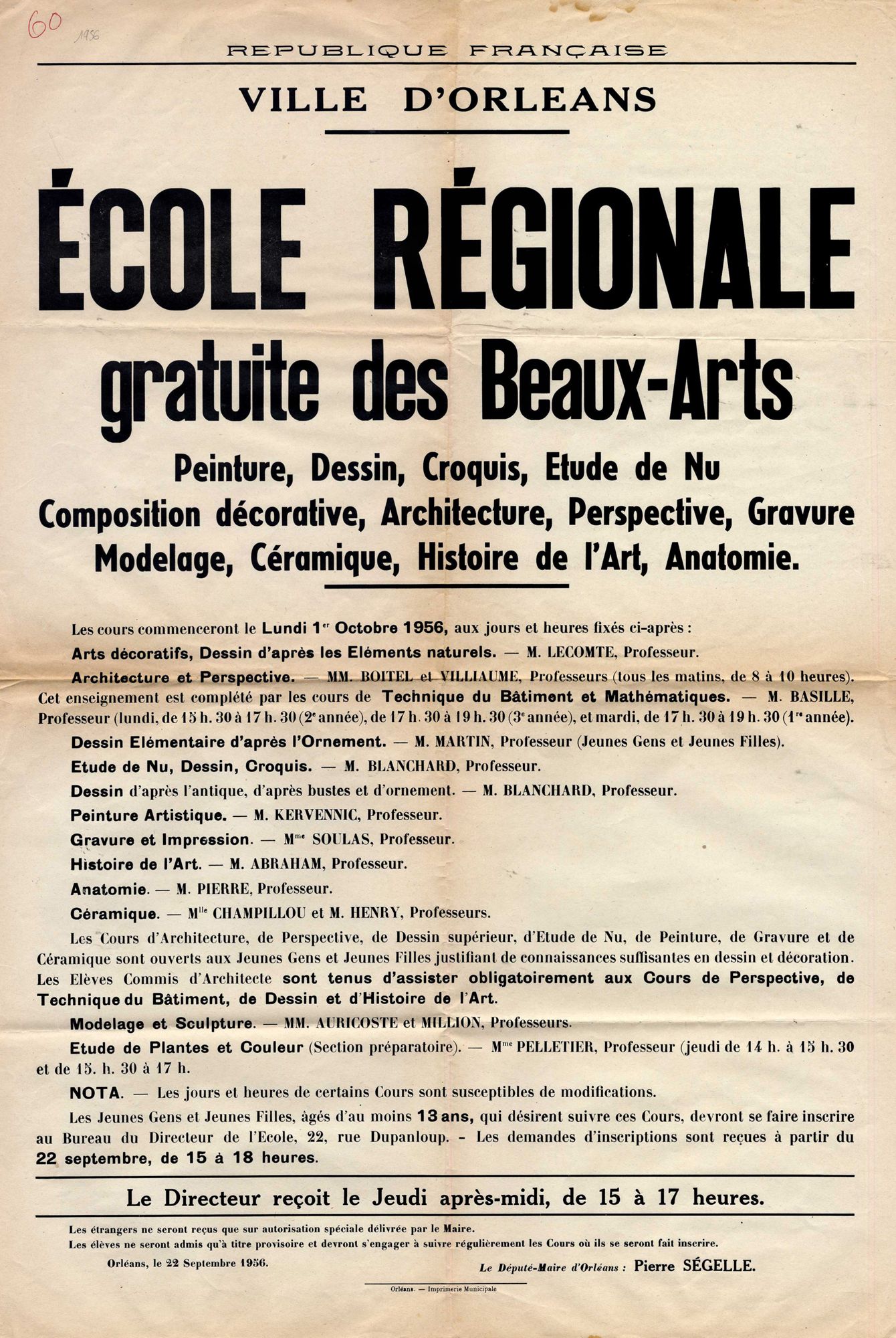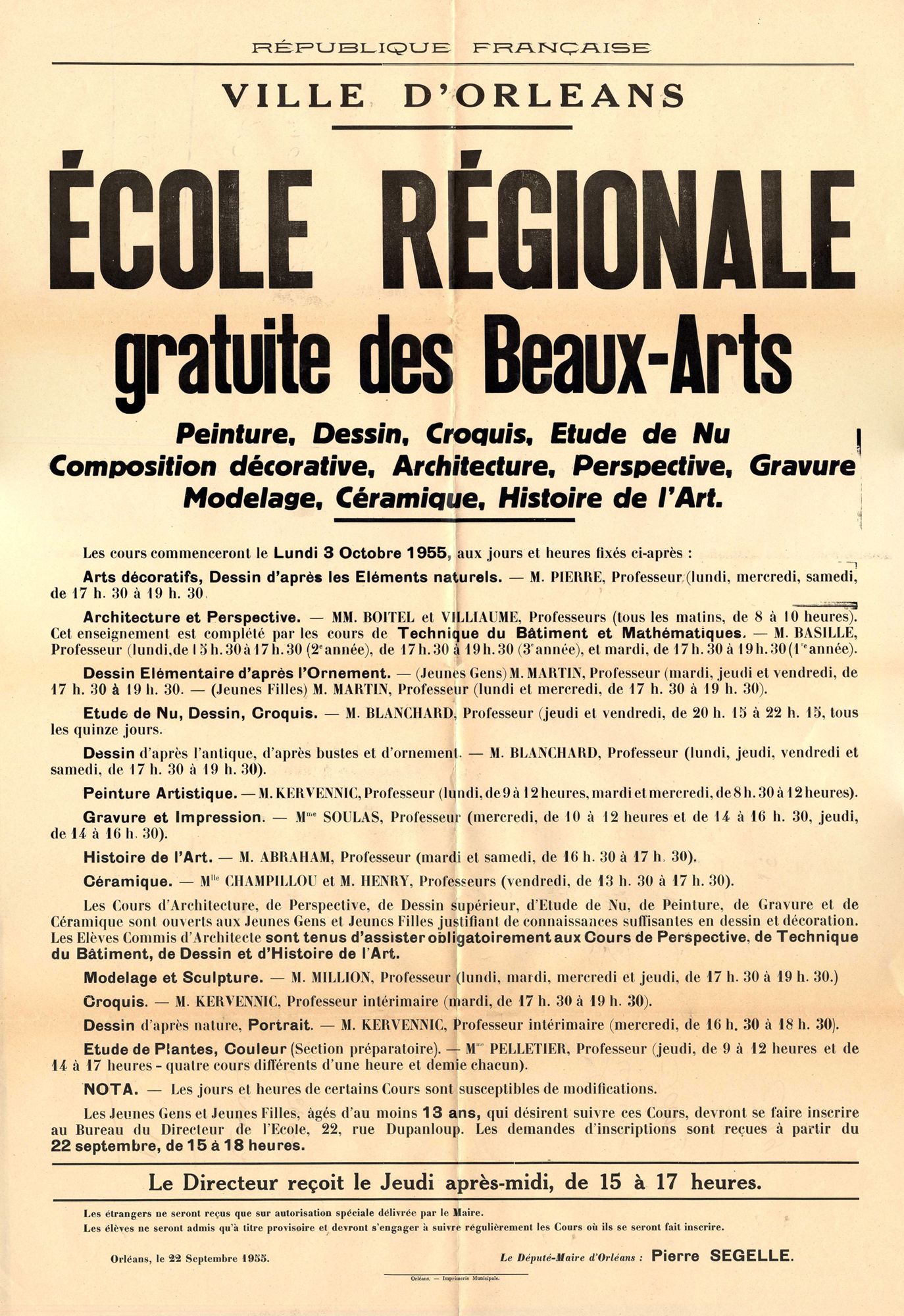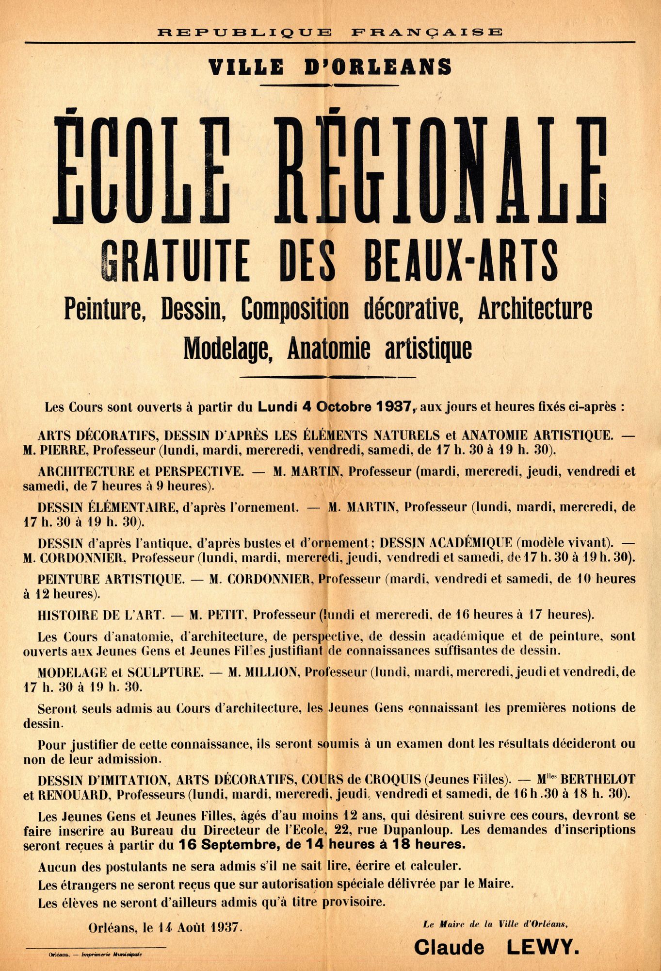 L'ouverture et l'évolution des cours au fil des affiches administratives : 1925-1972 L'ouverture et l'évolution des cours au fil des affiches administratives : 1925-1956 Cours professionnels obligatoires. Inscriptions. 1925. Affiche administrative. AMO, 15Fi2337 Cours professionnels obligatoires. Inscriptions. 1926. Affiche administrative. AMO, 15Fi2368 Cours professionnels obligatoires. Inscriptions. 1929. Affiche administrative. AMO, 15Fi2423 Cours professionnels obligatoires. Inscriptions. 1930. Affiche administrative. AMO, 15Fi2442 Ecole régionale gratuite des beaux-arts. Peinture, dessin, composition décorative, architecture, modelage, anatomie artistique. 1936. Affiche administrative. AMO, 15Fi2533 Cours professionnels obligatoires. Inscriptions. 1937. Affiche administrative. AMO, 1R1121 Ecole régionale gratuite des beaux-arts. Peinture, dessin, composition décorative, architecture, modelage, anatomie artistique. 1937. Affiche administrative. AMO, 15Fi2547 Ecole régionale gratuite des beaux-arts. Peinture, dessin, croquis, composition décorative, architecture, perspective, gravure, modelage, histoire de l'art. 1945. Affiche administrative. AMO, 15Fi2637 Ecole régionale gratuite des beaux-arts. Peinture, dessin, croquis, composition décorative, architecture, perspective, gravure, modelage, histoire de l'art. 1946. Affiche administrative. AMO, 15Fi2647 Ecole régionale gratuite des beaux-arts. Peinture, dessin, croquis, composition décorative, architecture, perspective, gravure, modelage, céramique, histoire de l'art. 1950. Affiche administrative. AMO, 15Fi2669 Ecole régionale gratuite des beaux-arts. Peinture, dessin, croquis, étude de nu, composition décorative, architecture, perspective, gravure, modelage, céramique, histoire de l'art. 1955. Affiche administrative. AMO, 15Fi2689 Ecole régionale gratuite des beaux-arts. Peinture, dessin, croquis, étude de nu, composition décorative, architecture, perspective, gravure, modelage, céramique, histoire de l'art, anatomie. 1956. Affiche administrative. AMO, 1R2041 Ecole régionale des beaux-arts d'Orléans. Enseignement-Admission. 1972. Affiche administrative. AMO, 1R2046 1 / 13