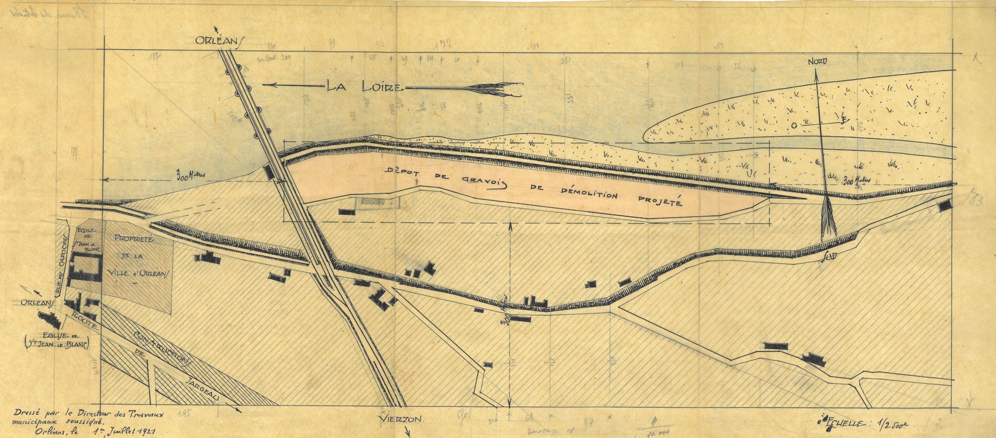 A l’époque, le quai Neuf Tudelle est le seul qui ne se prolonge pas en ligne droite au contraire des autres quais de la ville qui ont fait l’objet d’importants travaux de comblement et d’aménagement les années précédentes. Au sud-ouest du pont Royal, la route est courbe pour se raccorder à l’avenue de Saint-Mesmin. La levée construite pour la protection contre les inondations serpente vers l’ouest, vers l’Ile Arrault et des terrains submersibles. L’idée est donc à la fois d’embellir et de protéger la ville en utilisant des terrains inondables mais aussi de gagner sur le fleuve lui-même. Le chemin aménagé permettra aussi à la garnison de se rendre sur le futur champ de manœuvres aménagé à L’Ile Arrault.