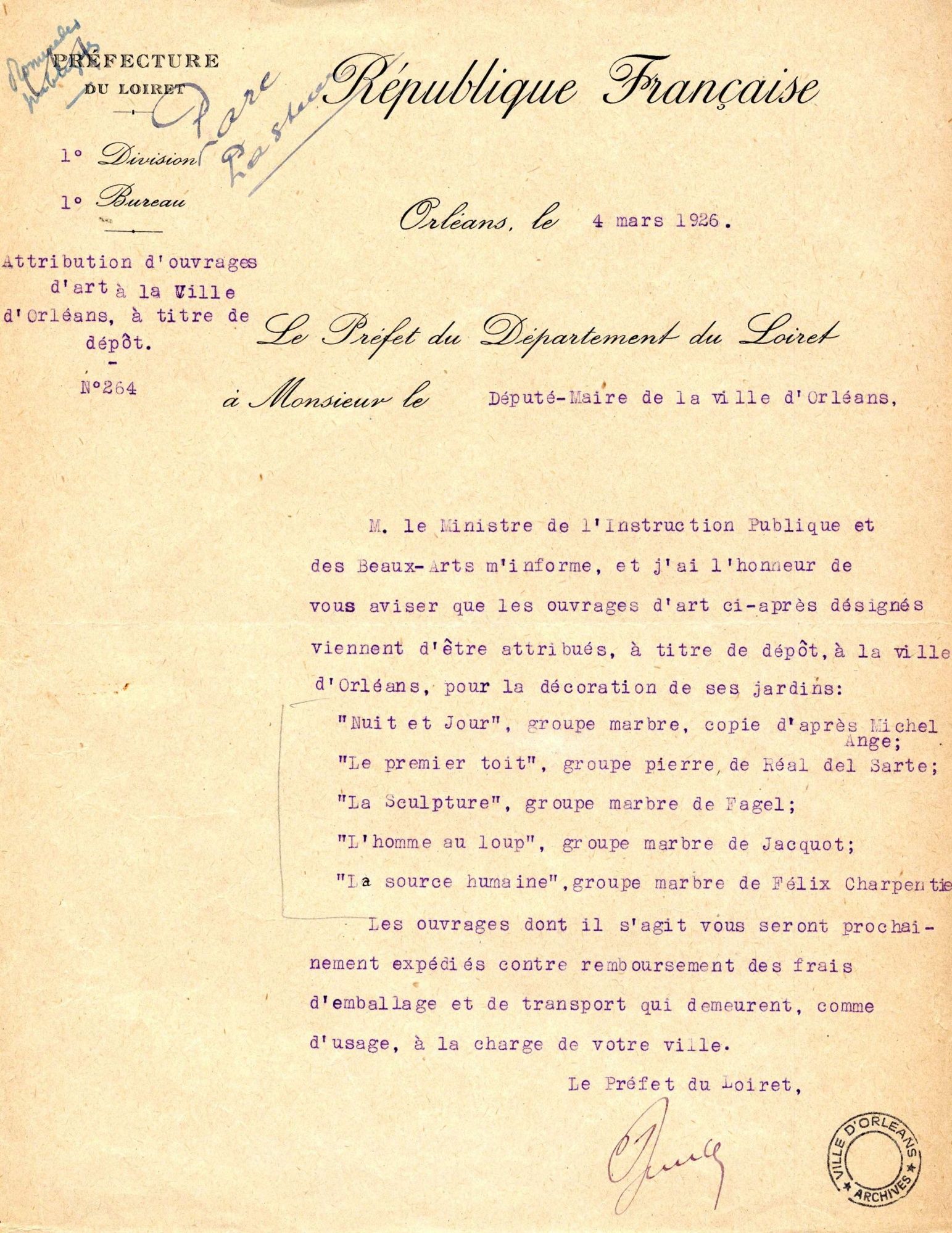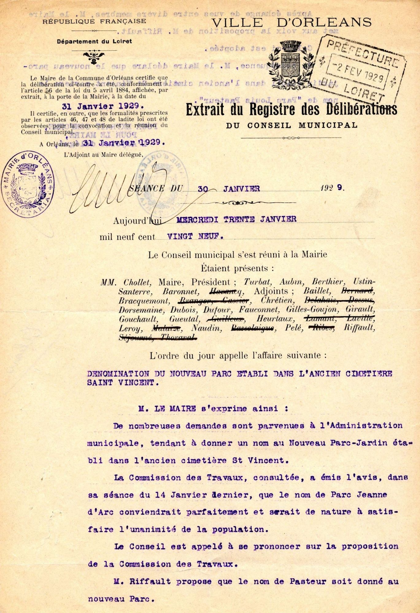 Le 30 janvier 1929, le parc est baptisé Louis-Pasteur en hommage au scientifique dont les travaux sur la fermentation contribua à sauver l’industrie orléanaise du vinaigre. Dès sa création, le parc constitue aussi un vaste espace d’exposition à ciel ouvert. Plusieurs statues sont déposées par le Musée du Louvre telles que le groupe La Source humaine de Félix Charpentier qui surplombe le bassin ou encore Le Premier Toit de Maxime Real del Sarte.