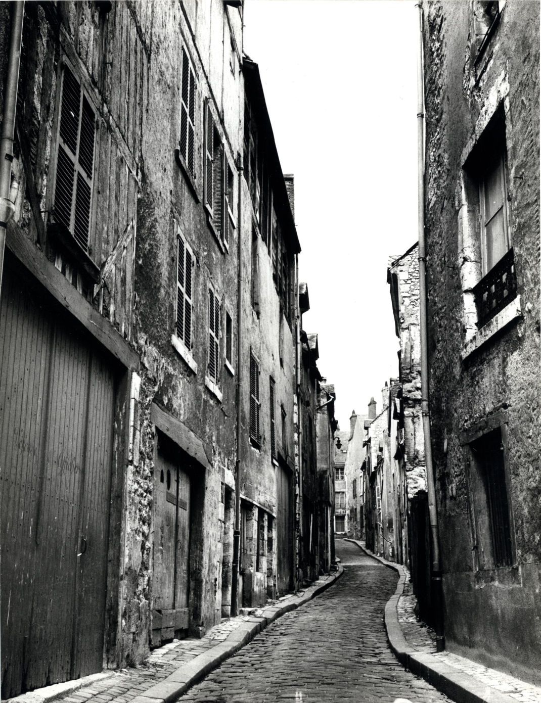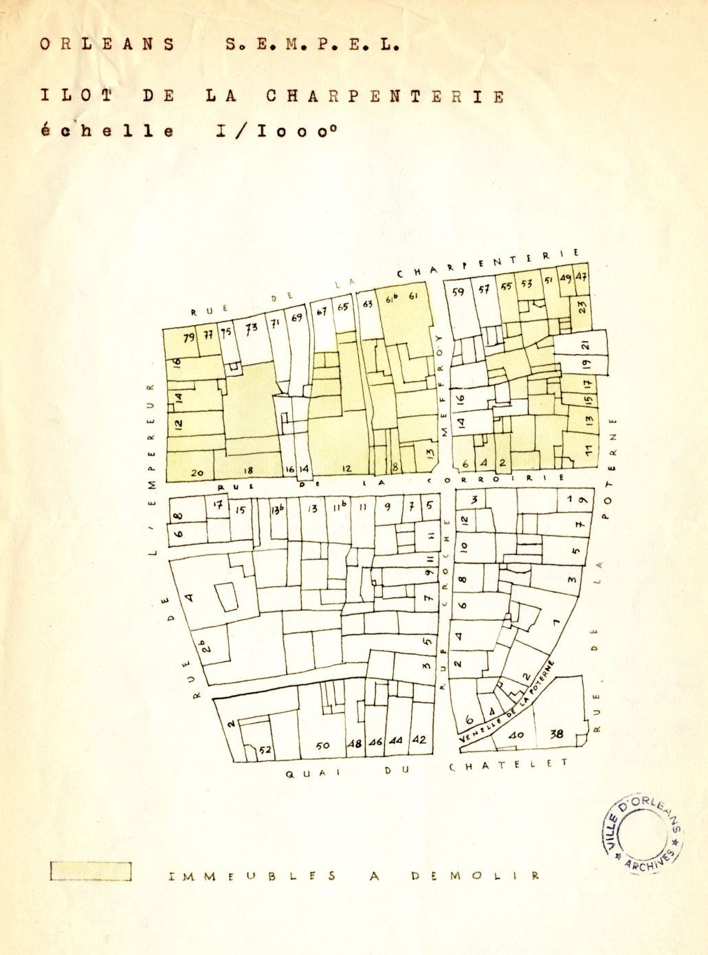 A la veille de son premier aménagement, dans les années 1960, « La Charpenterie » est encore composée de quatre îlots urbains d’origine médiévale. Délimité à l’ouest et à l’est par les rues de l’Empereur et de la Poterne, cet ensemble bâti sur près d’un hectare descend en pente douce depuis la rue de la Charpenterie, au nord, jusqu’au quai du Châtelet, au sud. A l’intérieur, deux rues se croisent : la rue de la Corroierie, d’est en ouest, et la rue Croche-Meffroy, du nord au sud. En bas, l’impasse du Vaudour et l’impasse de la Poterne forment des appendices aux rues éponymes.
