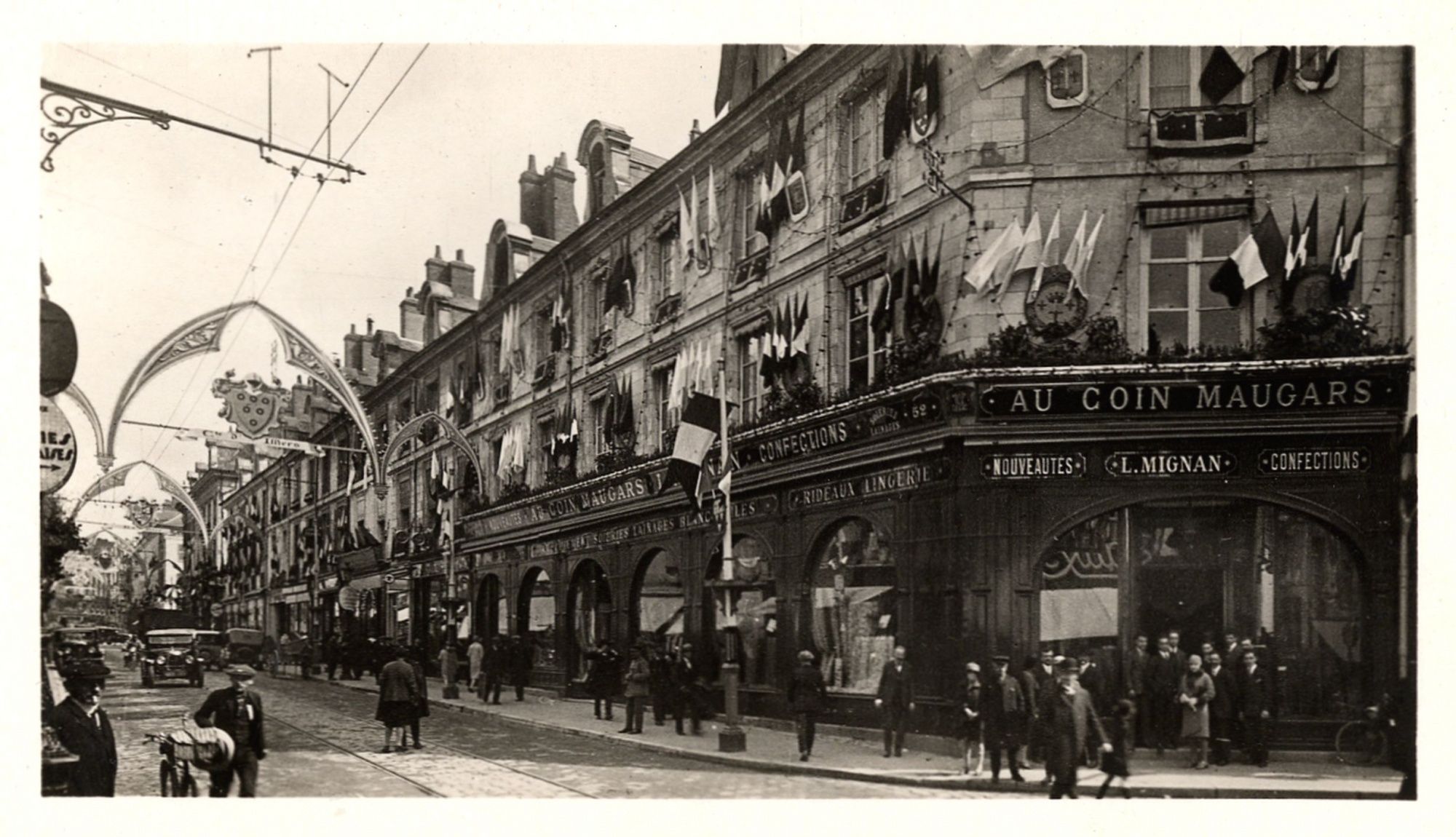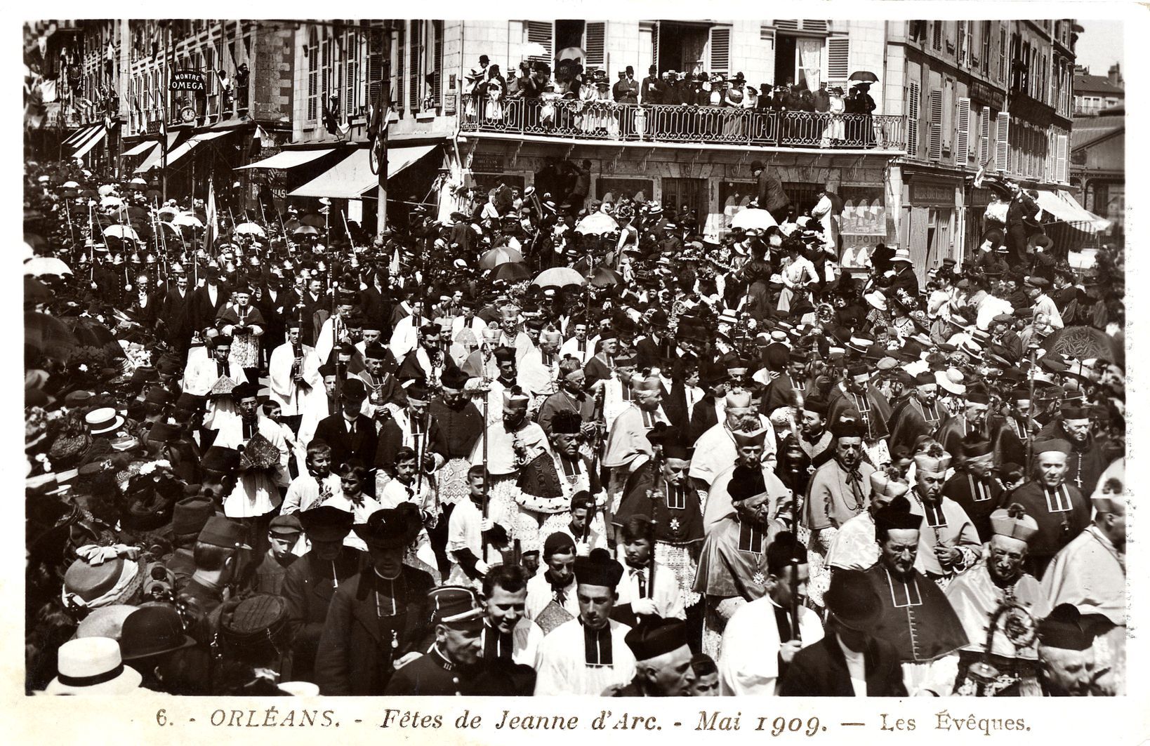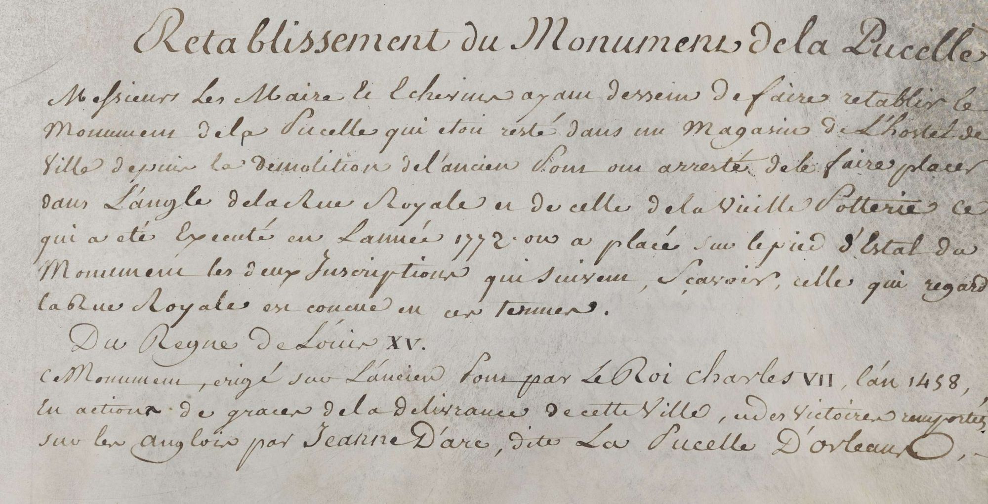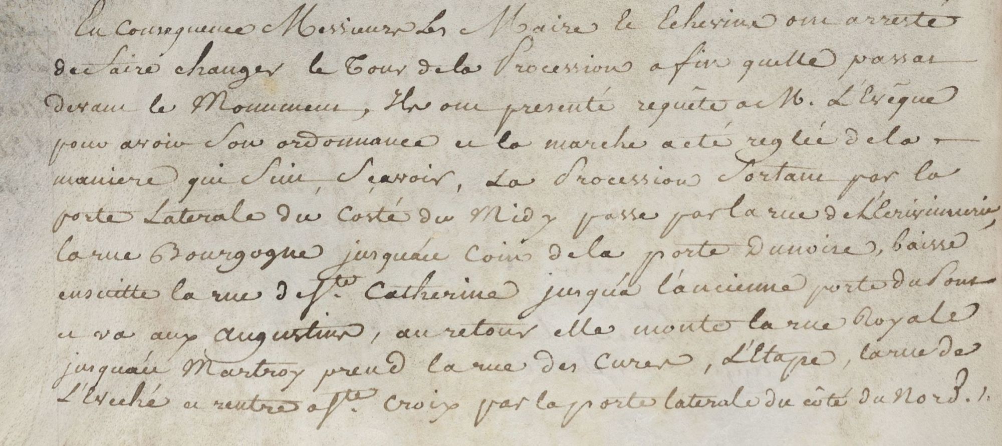 « Messieurs les Maire et Echevins ont arrêtés de faire changer le tour de la procession afin qu’elle passa devant le monument, ils ont présentés la requête à monsieur l’Evêque pour avoir son ordonnance et la marche a été réglée de la manière qui suit, savoir la procession sortant par la porte latérale [de la Cathédrale] du côté du midi, passe par la rue de l’Ecrivenerie, la rue de Bourgogne jusqu’au coin de la porte dunoise, ensuite la rue Sainte-Catherine jusqu’à l’ancienne porte qui va aux Augustins, au retour elle monte la rue Royale jusqu’au Martroy, prend la rue des curés, l’Etape, la rue de l’Evêché et rentre par la porte latérale du côté du Nord » (Archives municipales d’Orléans, BB19).