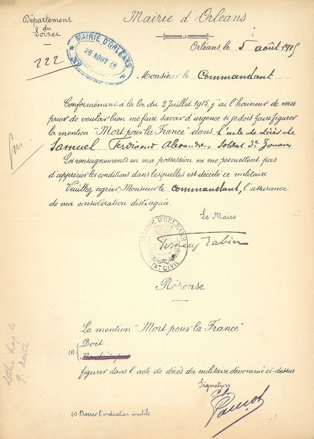 L’inscription « Mort pour la France » sur les actes d’état civil est instituée par la loi du 2 juillet 1915. La mention est attribuée aux civils et aux soldats victimes de la guerre, décédés entre le 2 août 1914 et le 24 octobre 1919. L’inscription est uniquement autorisée aux militaires tués à l’ennemi, morts des suites de leurs blessures ou d’une maladie contactée sur le champ de bataille. Cette reconnaissance justifie également le versement de pensions, de primes et d’allocations de guerre aux veuves et aux orphelins. Dès 1914, les maires sont chargés du suivi des demandes d’attribution ou de refus de la mention qui est validée par l’autorité militaire. Créés par la loi du 27 avril 1916, des diplômes d’honneur des militaires morts pour la patrie sont également transmis aux maires chargés de les remettre aux familles avec toute la solennité possible.