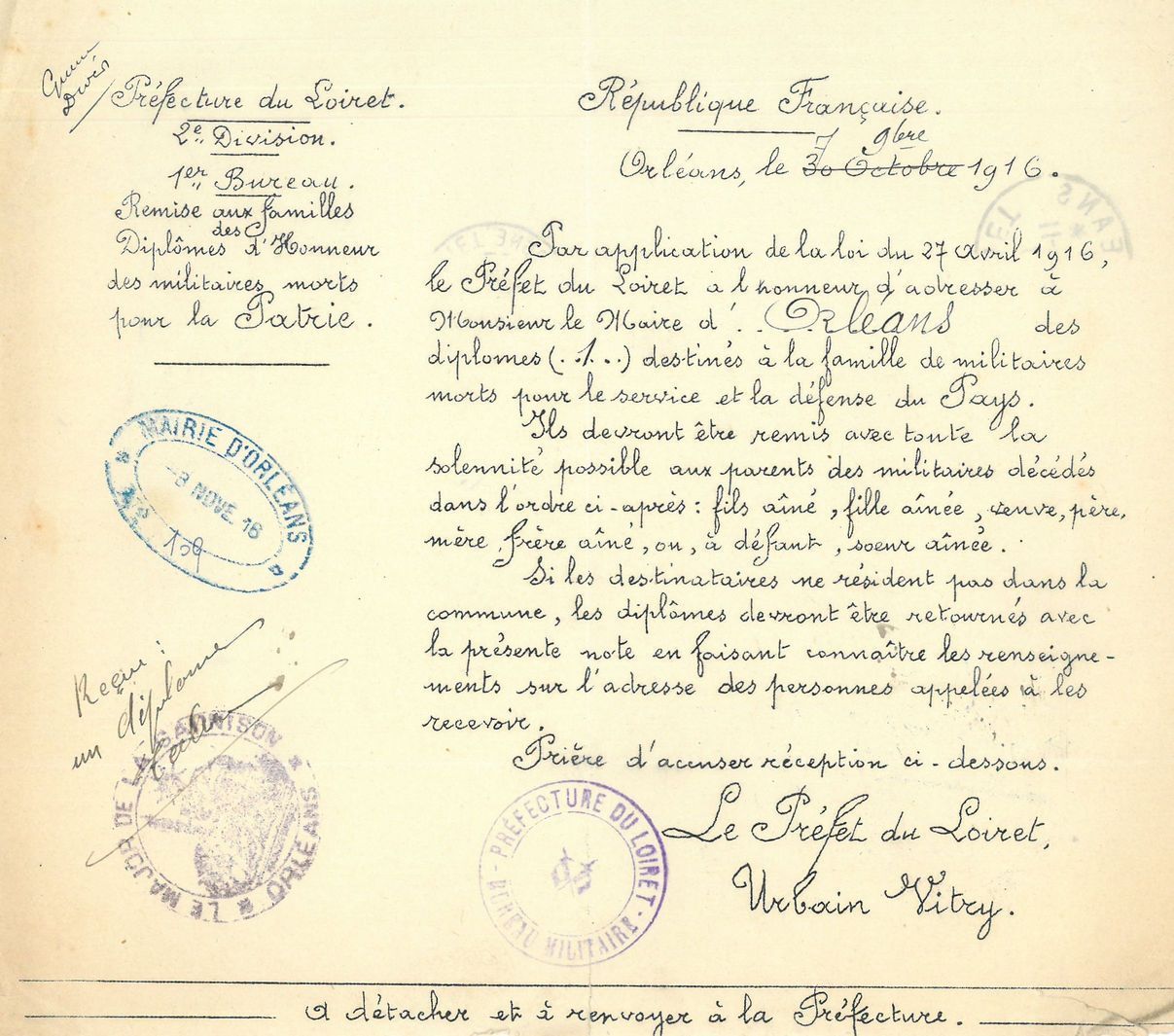 1915 - Institution de la mention « Mort pour la France » et du diplôme d’honneur