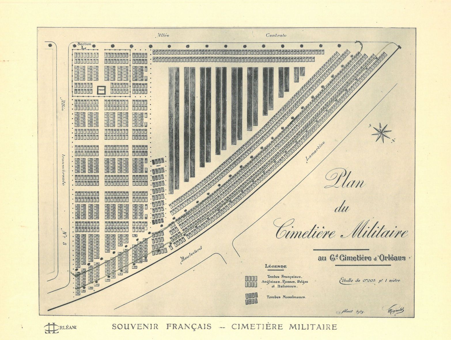 En 1908, le comité du Souvenir Français obtient gratuitement la concession à perpétuité d’un terrain de 500 mètres carrés dans le Grand Cimetière. Ce cimetière militaire est destiné à la sépulture des militaires de la garnison d’Orléans décédés en activité et dont les corps n’ont pas été réclamés par les familles. Le terrain est alors entouré de bornes de pierre reliées par des chaînes. Un caveau ossuaire est construit en son centre surmonté d’un monument, afin d’y replacer les corps exhumés au terme d’une période de 10 ans.