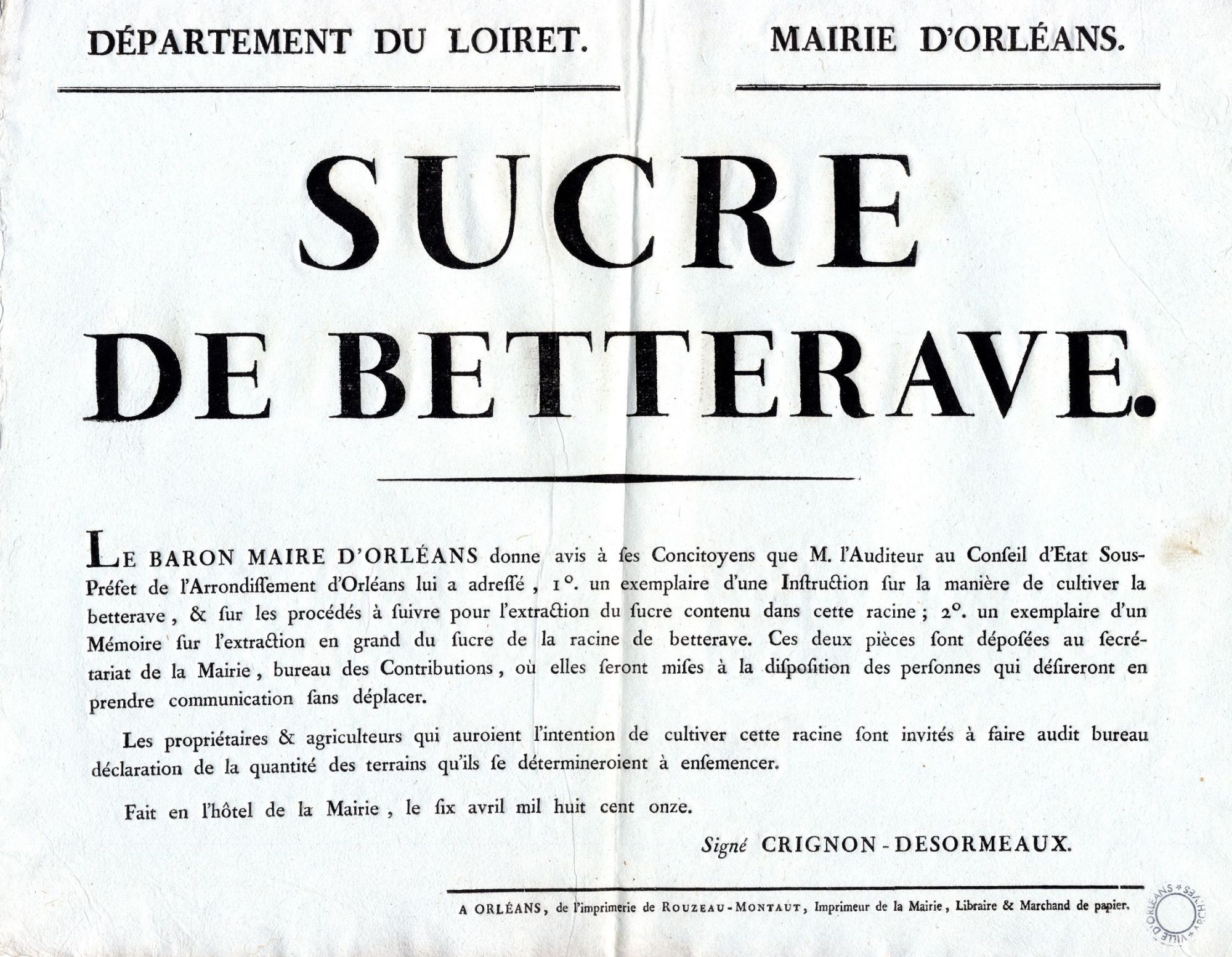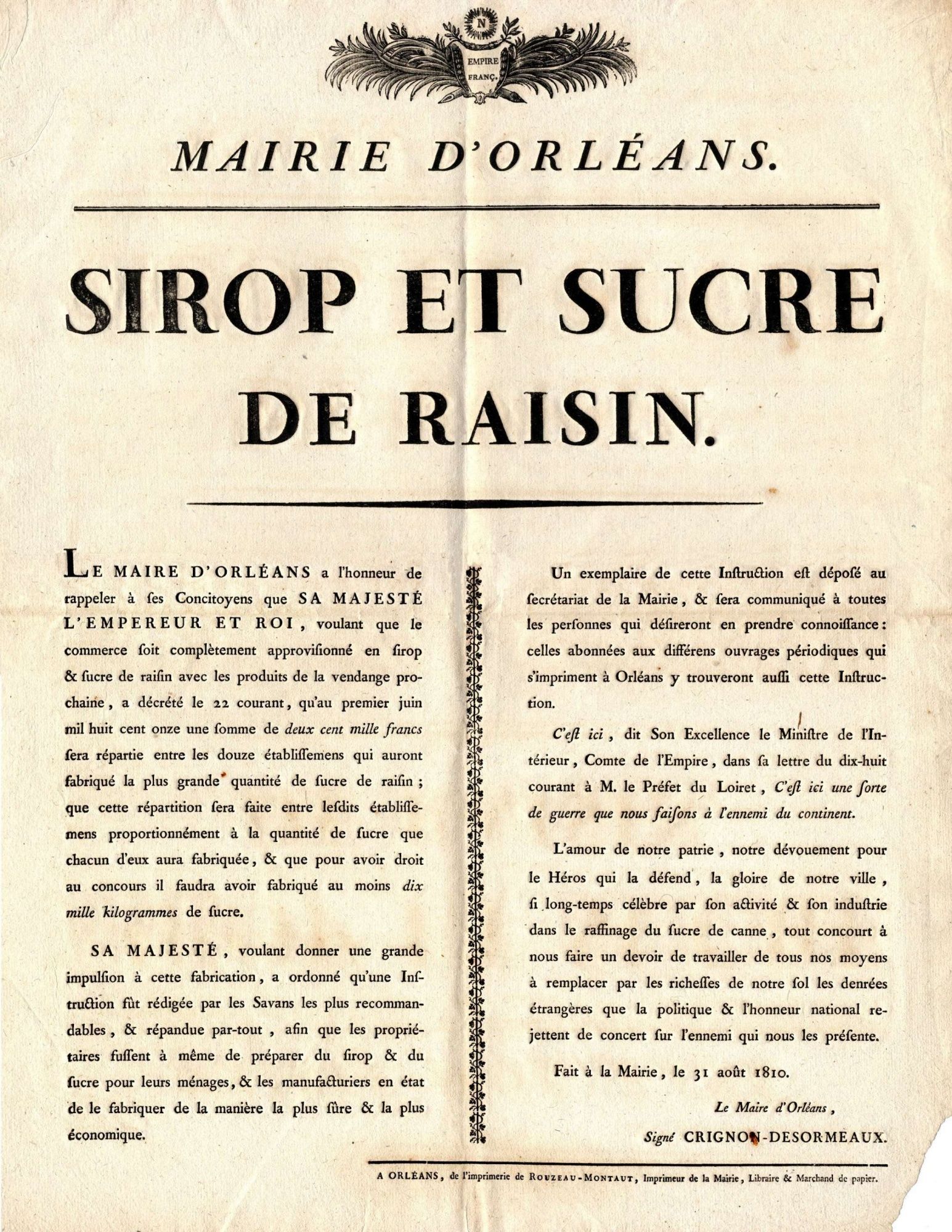 La perte des colonies et le blocus anglais provoque une baisse de l'approvisionnement en matière première. De 32 établissements en 1793, Orléans n’en compte plus que 9 en 1814. Ils connaissent d’ailleurs de grandes difficultés à survivre. Enfin, le port de Nantes est progressivement abandonné au profit de celui du Havre d'où les marchandises sont emmenées à Paris et non à Orléans. Ces difficultés touchent également les autres corps de métiers liés au sucre. Afin de faire cesser la pénurie de matière première, les autorités s'efforcent de trouver un substitut à la canne à sucre. Plusieurs végétaux cultivés en France, comme le raisin qui peut être fourni en quantité à Orléans, sont évoqués, mais c'est finalement la betterave à sucre qui va être favorisée. À cette époque, on trouve des raffineurs du nom de Rime, Crignon de Bonvalet, Allard ou Robert des Francs. Cependant, cette industrie rencontre des difficultés en raison de la concurrence des villes bordant Paris et celle des grands ports maritimes. En 1830, on dénombre 12 raffineries de sucre, contre 4 en 1840 et 1 en 1850 : la fin de cette industrie est irrémédiable.