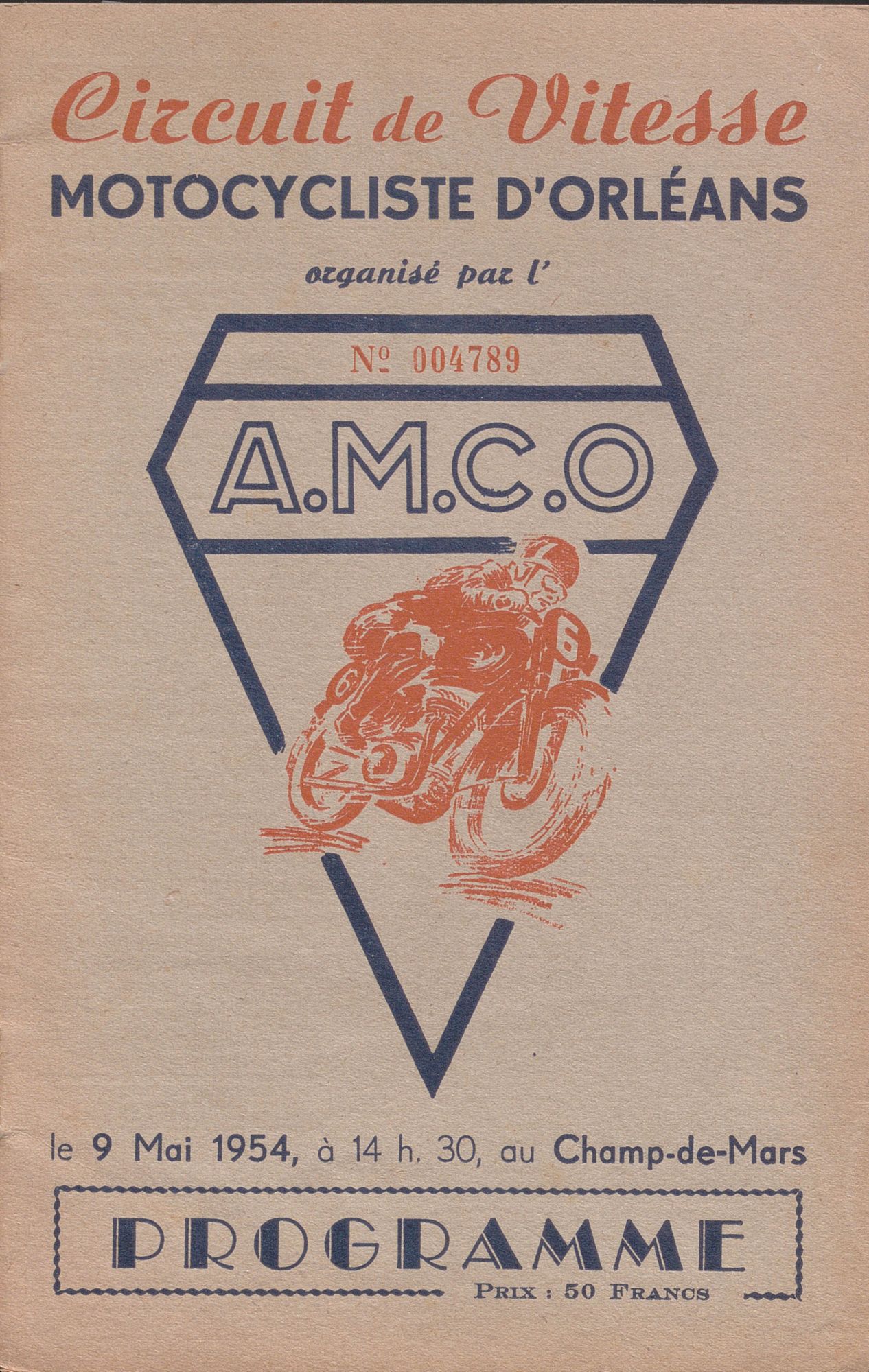 Chaque programme affiche une couverture sobre avec un dessin de motard roulant à plein vitesse s’inscrivant dans le sigle de l’AMCO. Aucune signature d’illustrateur n’y figure. Il est vendu au prix de 50 anciens francs (soit 1, 56 €).