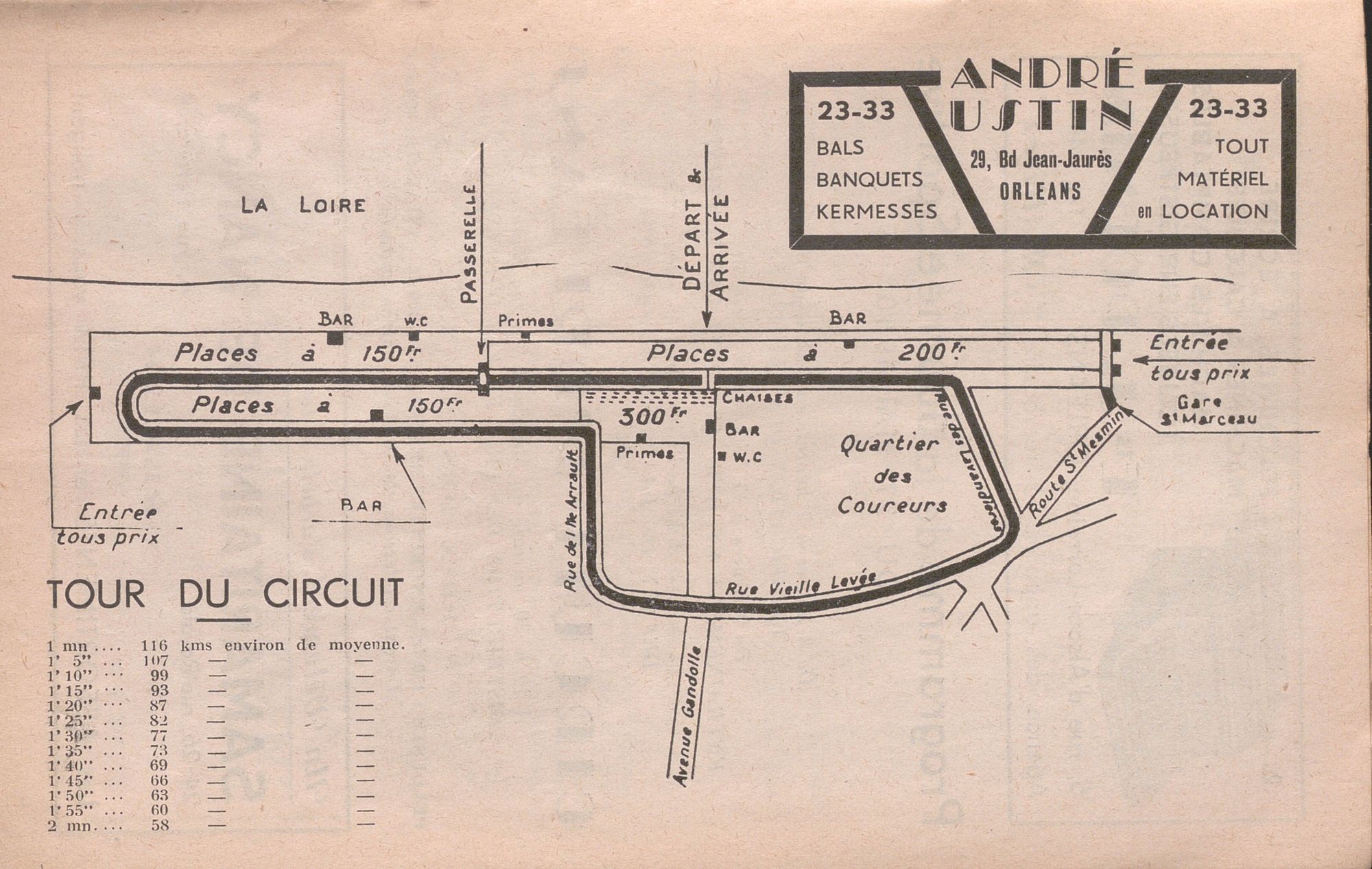 Une page est dédiée au plan du circuit. Long de 1 930 mètres, le parcours emprunte les rues des Lavandières, Vieille-Levée, de l’Ile-Arrault et l’avenue du Champ-de-Mars. Composé de six virages et de trois lignes droites, il offre un tracé à la fois intéressant et technique. Le Circuit d’Orléans est la première épreuve du Championnat de France et « amène à Orléans les meilleurs coureurs de chaque catégorie » comme le soulignent les programmes.