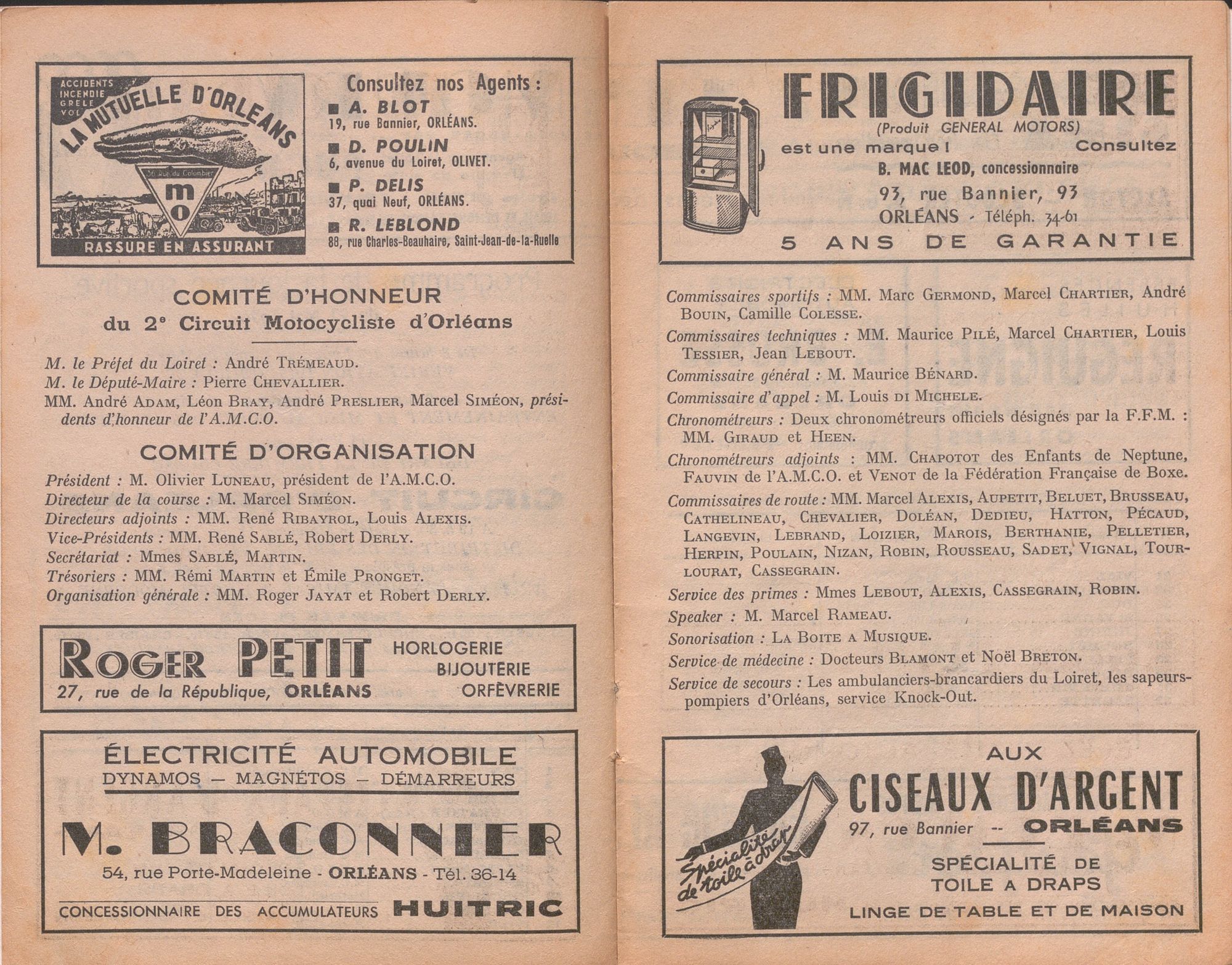 En parcourant le programme, l’amateur de moto s’informe de l’historique du circuit d’Orléans, du comité d’honneur et du comité d’organisation de cette manifestation sportive. La liste des prix est bien détaillée. Les vainqueurs reçoivent des coupes de la Ville d’Orléans (uniquement pour les coureurs orléanais), de l’Union syndicale des hôteliers, limonadiers et restaurateurs d’Orléans, les coupes Coca-Cola et « La Vittelloise » auxquelles s’ajoutent des primes offertes par de grandes marques de spiritueux comme Suze, Cinzano, Pernod, Saint-Raphaël.
