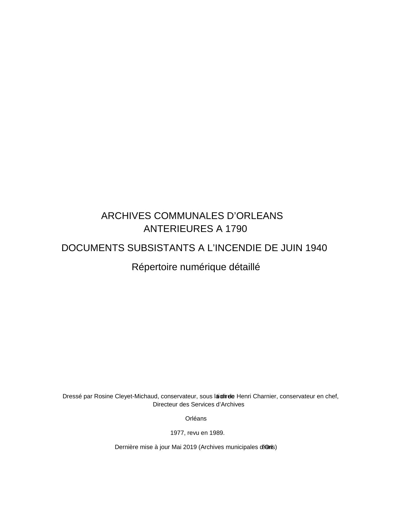 Inventaire sommaire des archives communales antérieures à 1790 : Etat avant destructions de 1940