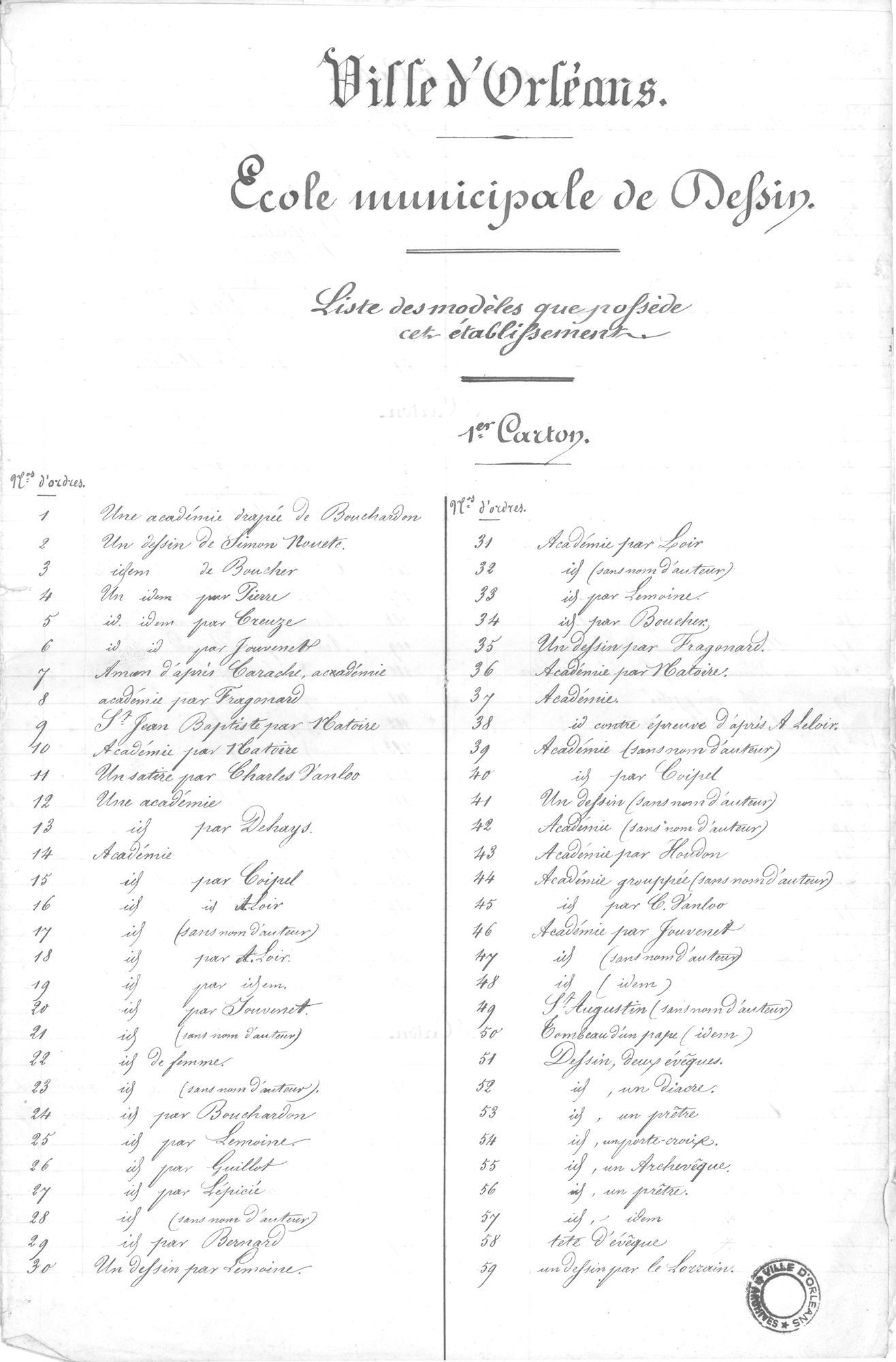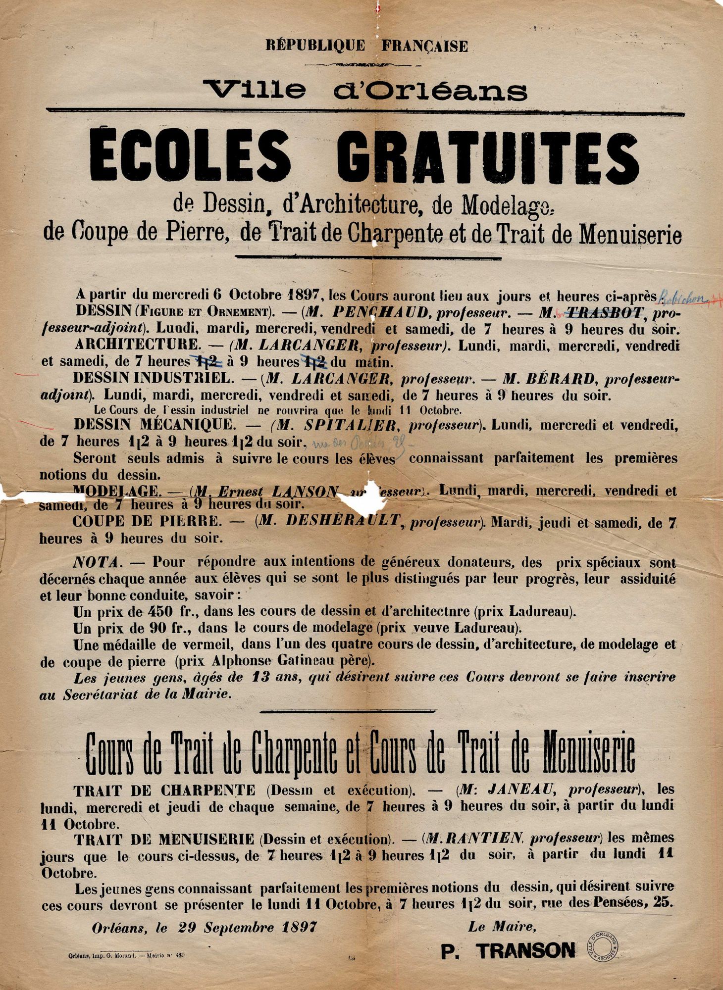 A son ouverture, ce cours professé par le sculpteur Augustin-François Allélit compte une trentaine d’élèves. Fréquenté par de jeunes ouvriers, il produit des élèves ornemanistes ou sculpteurs dans les ateliers d’Orléans.