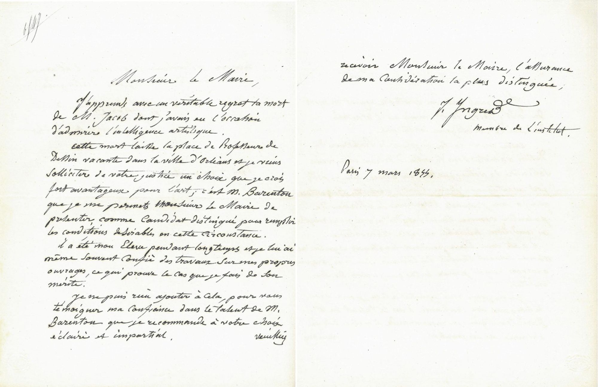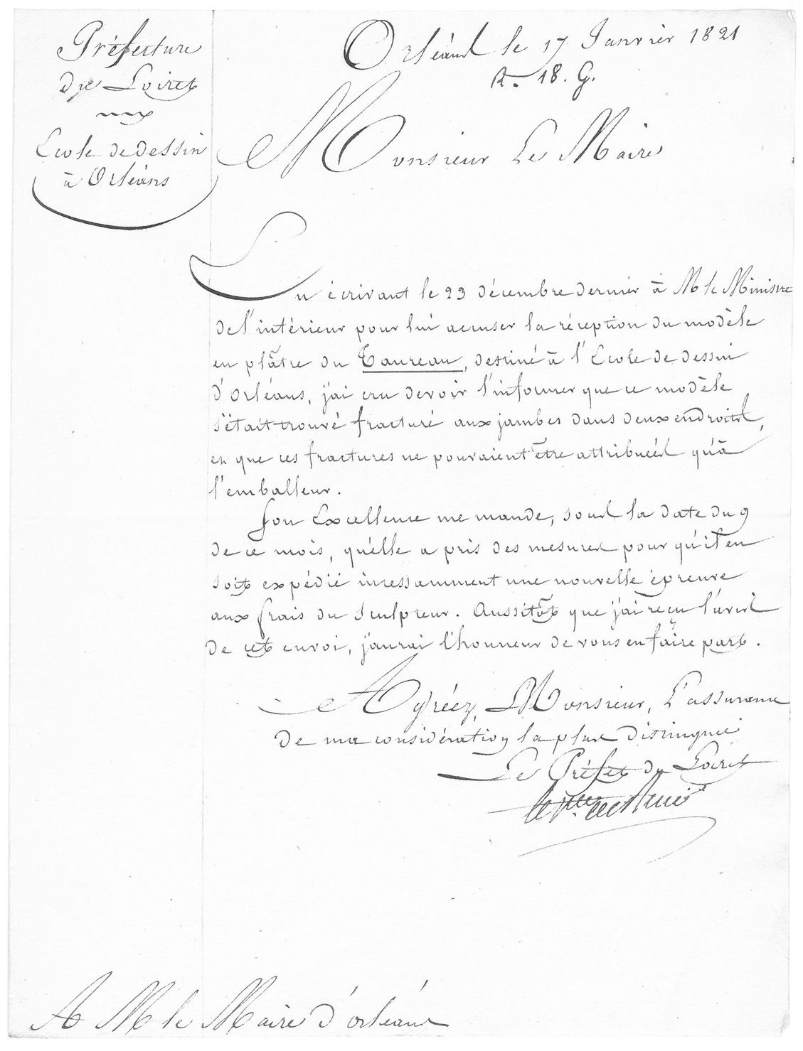 En 1821, le préfet du Loiret accuse réception du modèle en plâtre du taureau. Il informe par courrier le maire d'Orléans que la pièce est retrouvée fracturée en raison d'un emballage défectueux et qu'il demande une nouvelle épreuve au frais du sculpteur.